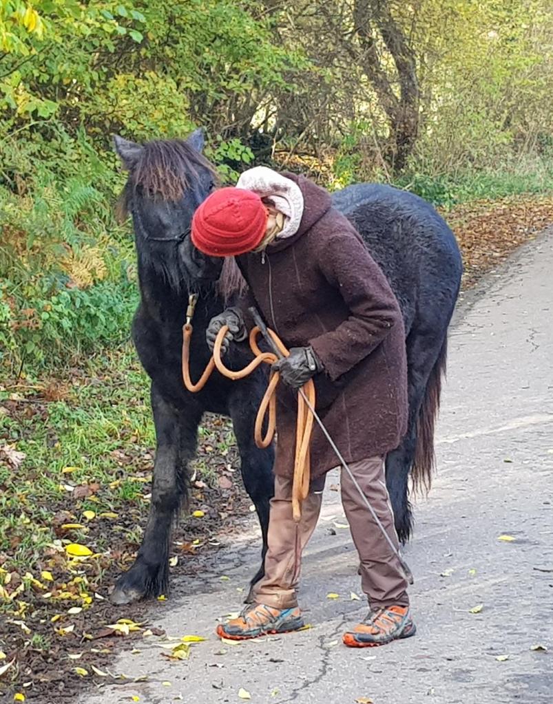 Ich habe keinen Bedarf, ihn irgenwie zu beeinflussen (außer dass jetzt nicht gegrast wird). Er geht, ich gehe mit. Mal bin ich rechts, mal links, mal vorne, mal weiter hinten. Ich fühle mich absolut sicher, sehe keinen Grund, etwas zu ändern. Als ein Auto von hinten kommt, drehe ich Duncan um und lasse ihn schauen. So findet er das Auto uninteressant, demnächst werden wir dann probieren was passiert wenn Autos von hinten kommen – das war für Finlay sehr lange ein Thema.