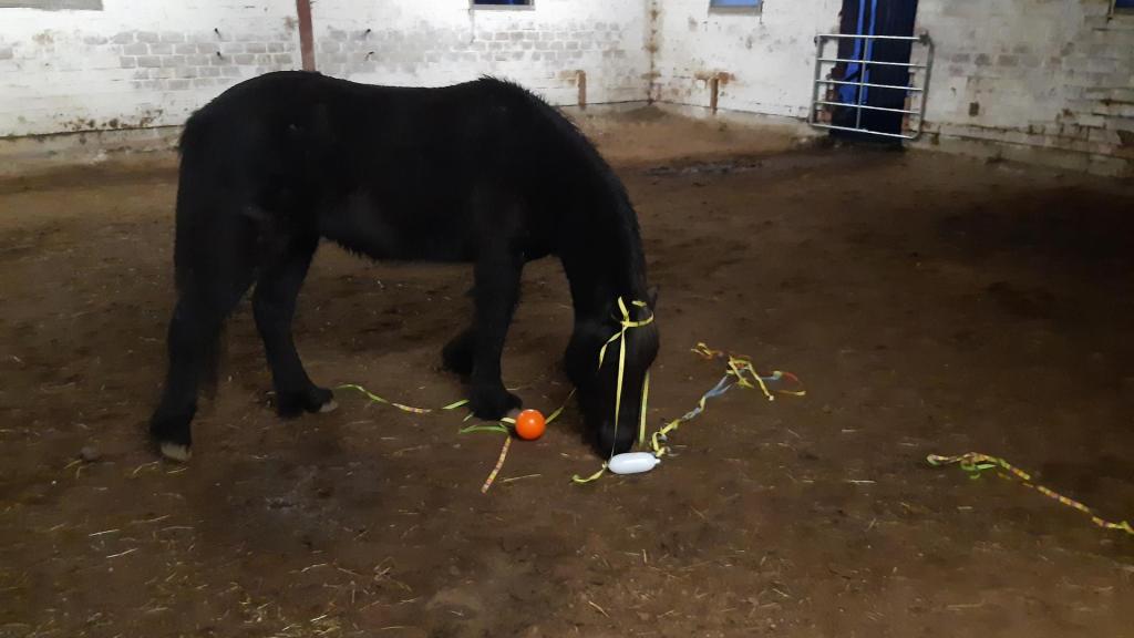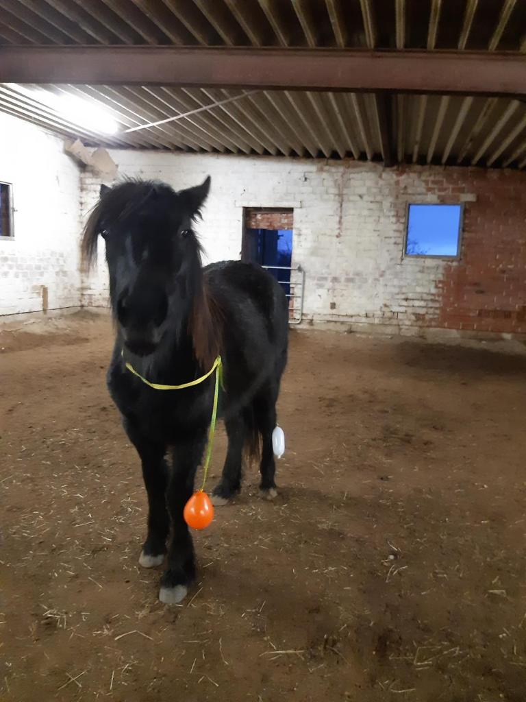 Caruso steht neben ihm (der weiß wie es geht und macht es vor) und was soll ich sagen: Duncan wartet, lässt sich einen Keks geben, wartet wieder, lässt sich wieder einen Keks geben…. Er weiß ganz genau wie das geht. Wie Finlay es immer gemacht hat, so macht er es auch: kein Huf bewegt sich (das ist die Keks-Bedingung). Der Hals reckt sich in die Nähe des Kekses, der Kopf wird schief gelegt, die Lippe vorgestreckt, das ganze Pony ist eine einzige Ungeduld. Aber die Hufe stehen wie angewurzelt. Ich kann nur vermuten, dass er mal wieder einfach nachmacht, was er bei den anderen sieht.