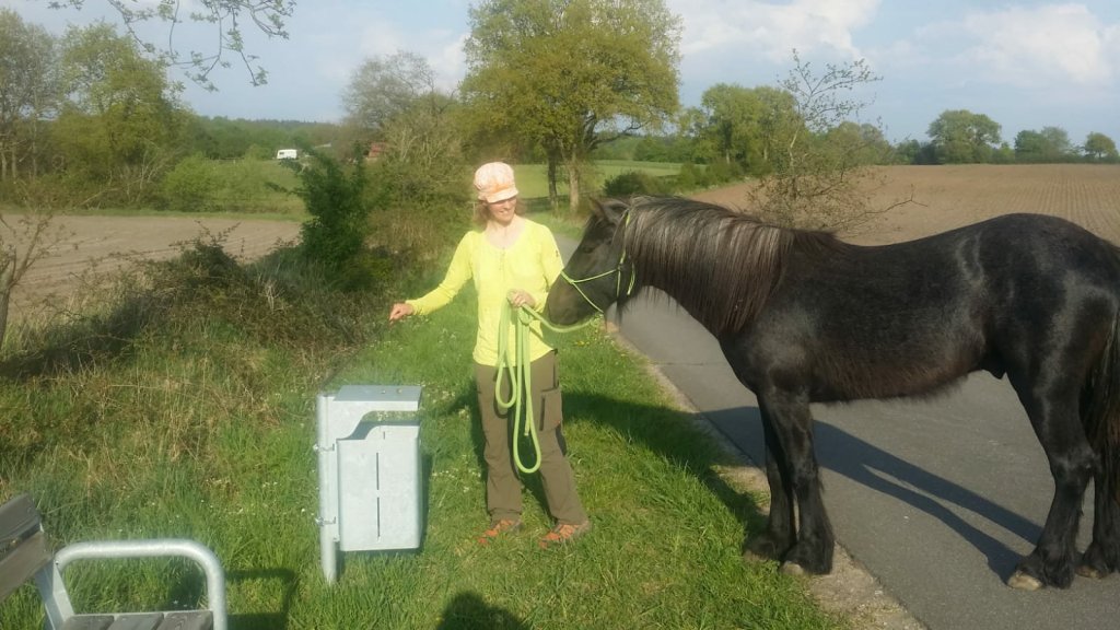 Seitdem macht mein Mädchen immer einen kleinen Halt bei diesem glänzenden Ding, wenn wir dort vorbeikommen. Und dann macht sie „Musik“ (ich finde es ist eher Krach). Neulich durfte ich derweil Gras essen. Mein Mädchen sagt, sie hat mir angesehen, dass ich doch noch nicht ganz furchtlos bin. Weil ich etwas hektisch gefressen habe und das Ding nicht aus den Augen gelassen habe. Aber sie sagt, wenn wir es oft genug machen, werde ich lernen, dass das Glänzeding mein Freund ist. Hm. Ok – wenn ich jedes Mal Gras essen darf könnte das wahr sein….