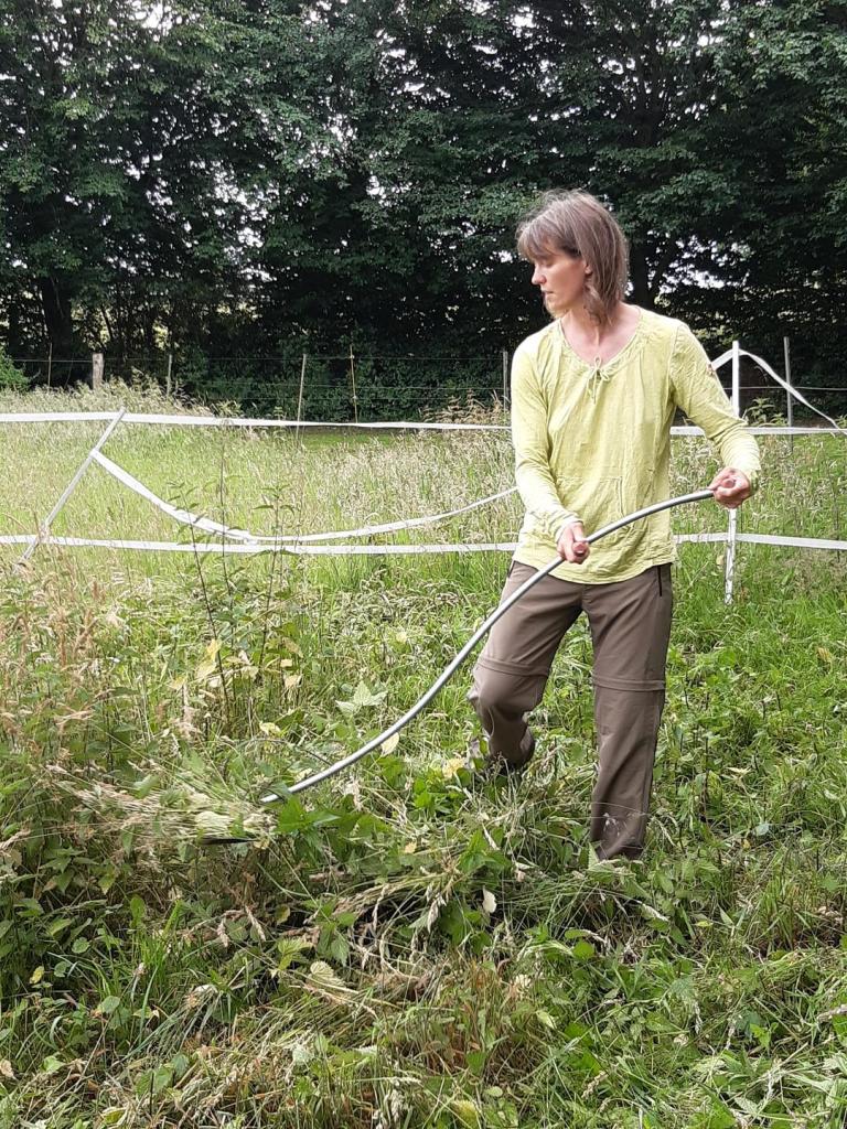 Naja, wenn die Brennnesseln abgemäht sind, mögen wir sie ganz gern. Erst suchen wir mit spitzen Lippen die Grashalme raus die dazwischen sind. Nach einer Weile sind die Brennnesseln dann nicht mehr so brennig und dann essen wir die auch. Soll sehr gesund sein, sagt mein Mädchen. Der Mann hat ihr das mit dem Sensen nochmal genau erklärt. Sie kann es jetzt etwas besser als vorher. Das ist auch wichtig, weil der arme Merlin nämlich schon wieder zum Zahnarzt musste und diesmal sind ihm 3 Schneidezähne gezogen worden – armer Kerl. Und deswegen senst mein Mädchen ihm jetzt sein Gras, damit er nicht selbst rupfen muss. Aber bald kann er das auch wieder selbst, hat sie gesagt.
