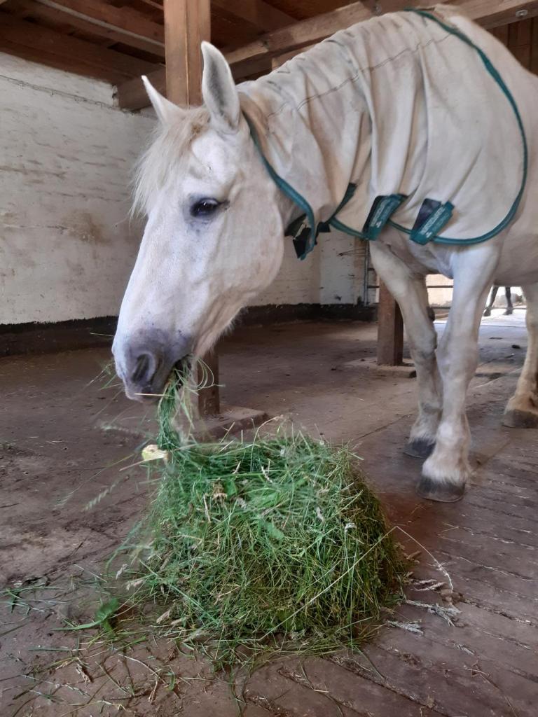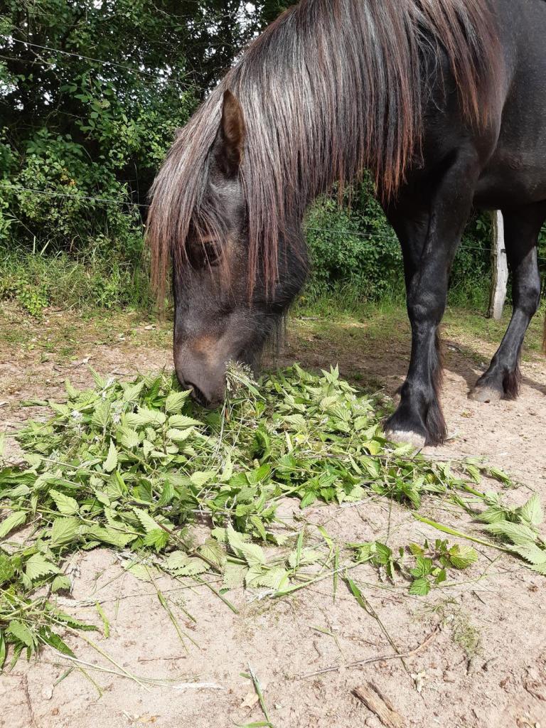 Manchmal serviert unser Mädchen statt Heu ein paar Brennnesseln. „Öko-Frühstück“ nennt sie das. Wir Ponys nennen es „Resteessen“. Das was wir auf der Koppel verschmähen wirft man uns dann doch noch wieder vor die Hufe.
