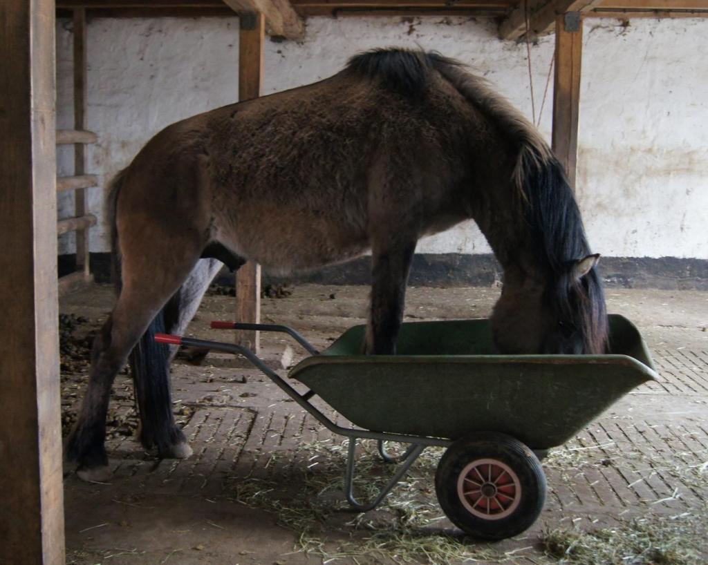 Manchmal bin ich meinem großen Bruder doch ähnlich, sagt mein Mädchen. Mein großer Bruder, das ist Finlay. Mein Bruder auf der anderen Seite der Regenbogenbrücke. Der von dem ich den Fahrzaum geerbt habe und von dem ich wahrscheinlich noch mehr gebrauchte Klamotten werde auftragen müssen (Ihr wisst ja, als kleiner Bruder kriegt man nie was eigenes neues!). Jedenfalls war ich abends mit Merlin und Caruso zusammen am Extra-Heu schmausen. Und ganz unten in der Schubkarre, da liegen immer die Grassamen, die aus dem Heu fallen. Die liebe ich! Wenn mein Mädchen die Schubkarre mit raus nehmen will, weise ich sie immer darauf hin, dass das leckerste noch drin ist und dass sie die Karre mal schön da lassen soll bis ich das weggemuffelt habe! Manchmal holt sie mir das dann alles da raus und nimmt die leere Schubkarre mit. Manchmal lässt sie auch die Schubkarre stehen bis ich fertig bin. Und sie hat mir erzählt, dass mein großer Bruder mal in die Schubkarre rein geklettert ist, weil er fand, dass man dann leichter an das leckere Essen kommt. Da hab ich mir gedacht: das probiere ich auch mal aus! Habe einen Vorderhuf in die Karre gestellt. War bisschen rutschig, aber egal. Mein Mädchen meinte, ich sollte das nicht tun. Ich fand es aber gut und hab den zweiten Vorderhuf auch noch rein gestellt. Leider ist mein Mädchen aber nicht mehr ganz so entspannt wie zu der Zeit als mein Bruder das gemacht hat. Den hat sie erst fotografiert bevor sie ihn raus bugsiert hat. Bei mir hatte sie die Nerven nicht, sie wollte mich sofort wieder da raus haben. Hat wieder Angst gehabt, dass ich mir weh tun könnte. Ach Mädchen…. Naja sie hat mir dann da raus geholfen. Meint sie. Ich hätte das ja auch allein gekonnt. Aber weil ich mir so lieb hab helfen lassen gab es nachher einen Keks. Na gut.