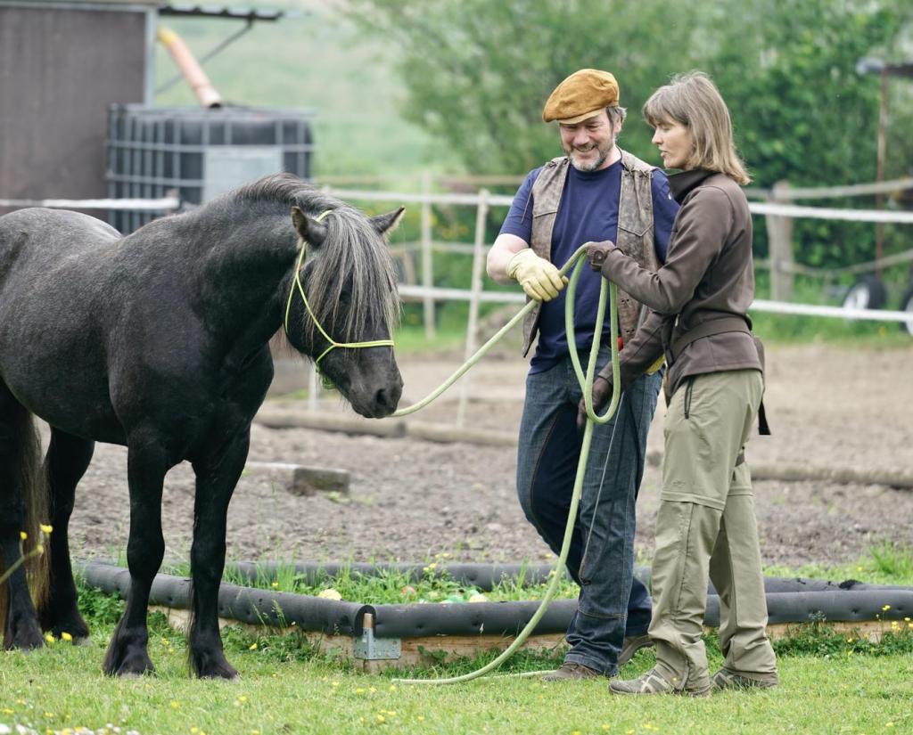Jedenfalls brauchte ich mal wieder dringend Unterricht. Denn Sir Duncan hat mich an technische Grenzen gebracht, die es zu überwinden gilt. So ein kleiner Hengst, der kann schon mal über die Stränge schlagen. Und mein Duncan, der hat (wohl auch altersbedingt aber auch bedingt durch Dinge die ich noch nicht über ihn weiß) gerade eine Art von (gefühlt) 0 auf 100 auf der Aufregungsskala zu springen, die mich in unangenehme Situationen bringt. Also brauche ich Unterricht – einen Lehrer, der mir zeigt, woran ich erkenne, dass Duncan eben NICHT bei 0 ist auf der Aufregungsskala (und auch nicht mehr bei 20, sondern bereits weit darüber) und der mir zeigt, wie ich damit so umgehen kann dass ich die Situation rechtzeitig entschärfe – bevor mein Pony wieder (wenn auch in schönster Manier) auf zwei Beinen neben mir steht.
