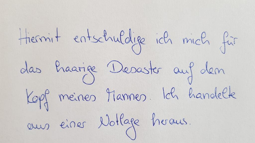 Der Mann hat auch keine lange Mähne, der hatte da keine Lust drauf. Also musste mein Mädchen ihm die Haare schneiden. Und jetzt weiß ich auch, warum sie das bei mir nicht tut: sie kann es nicht so gut. Deswegen hat sie dem Mann auch ein Entschuldigungsschreiben mitgegeben, als er neulich zum ersten Mal wieder beim Friseur war, weil es ihr so peinlich war.