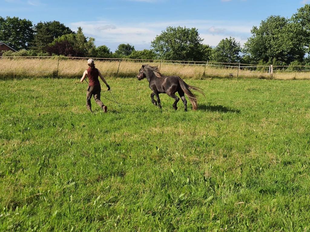 Jedenfalls ist der neue Reitplatz ansonsten ganz schön lustig. Weil er so schön groß ist und weil es da ein bisschen hügelig ist. Und weil mein Mädchen ganz viel neben mir her rennt und dann keucht und pustet und schwitzt. Das ist witzig! Sie hat echt null Kondition. Ich hab ihr dann mal gezeigt wie man richtig galoppiert, aber sie hat es nicht wirklich hinbekommen, das muss ich noch mit ihr üben. Trab kann sie schon ganz gut, wenn auch nur sehr kurz. Sie war jedenfalls restlos begeistert weil ich das alles so toll kann. Aus unerfindlichen Gründen hatte sie gedacht dass Galopp an der Leine noch zu schwer für mich ist – wegen der Kurvenlage. Hat sie mich nie beim Spielen beobachtet? Kurven kann ich, Mädchen. Und alles andere auch.