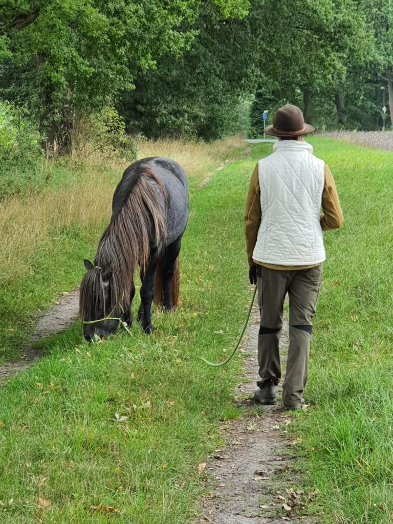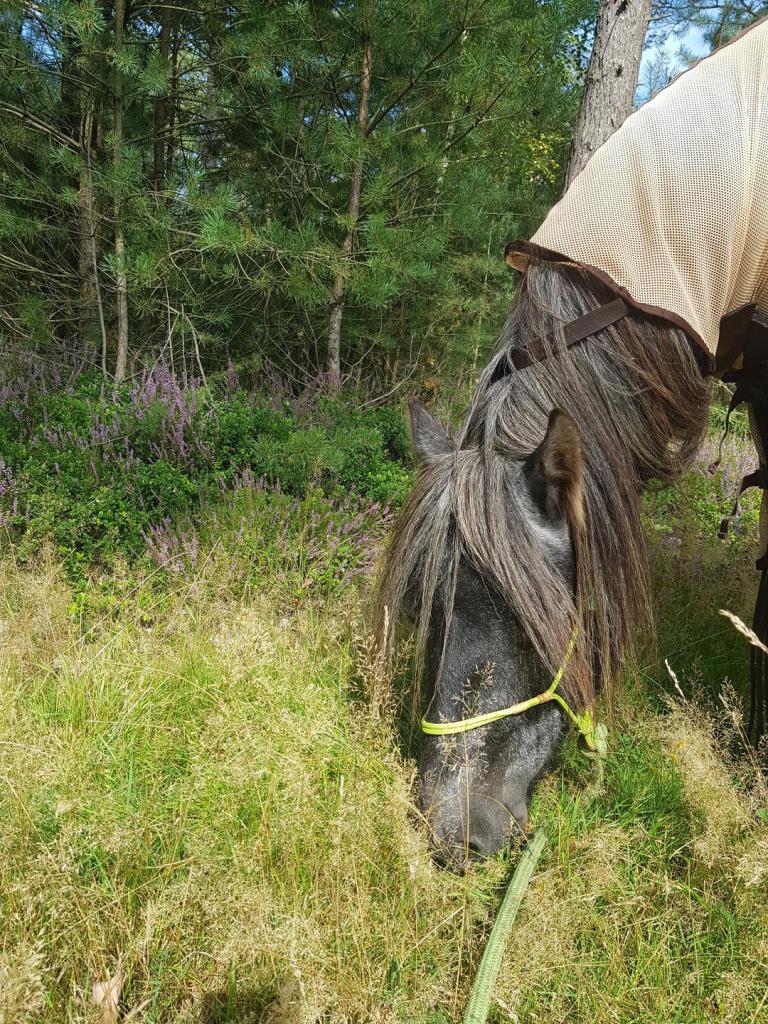 Am nächsten Tag sind wir dann gleich ordentlich los marschiert – ich hatte Euch hier davon berichtet. Es war ganz schön warm und als wir dann mittags nach hause gekommen sind, war da alles voller Fliegen! Mann die haben vielleicht genervt! Das waren diese gemeinen Fliegen die so fies beißen können! Diego der Große fand das ganz schlimm, der wollte immer gern alle Fliegen auf einmal vertreiben. Da kamen mein Mädchen und der Mann zu uns und haben uns unsere Ausreitdecken wieder drauf gemacht, die haben wenigstens ein bisschen geschützt. Und nach einer Weile, als die Füße von meinem Mädchen sich etwas erholt hatten, haben sie uns mitgenommen und wir sind zu einer Stelle gegangen wo wir am Wegesrand grasen konnten. Da waren auch nicht so viele Fliegen, zum Glück. Abends ging es dann auch im Paddock wieder, Fliegen gehen ja zum Glück früh schlafen. In der Nacht haben wir so viel Heu bekommen, dass wir gar nicht alles aufessen konnten! Das ist zu hause nie so. Da ist immer Diät. Aber im Urlaub darf man schlemmen, sagt mein Mädchen. Toll!