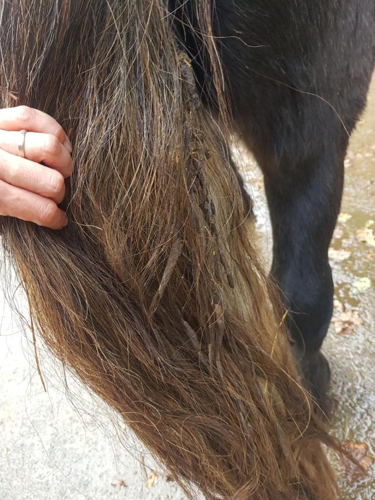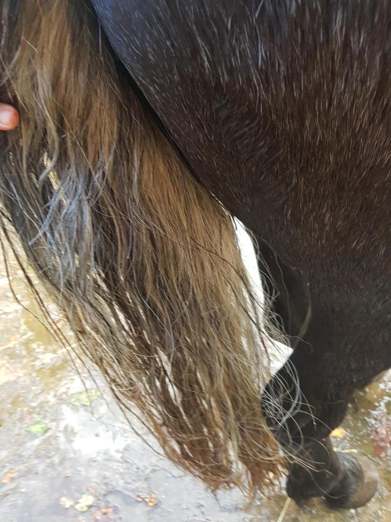 Aber manchmal sagt sie auch „igitt!“. Neulich als sie in meinen Schweif gefasst hat. Weil ja Fellwechsel und Wetterumschwung und herbstliches Gras unsere Bäuche ein bisschen durcheinander gebracht haben (deswegen gibt es wieder Schmatzofatz!), hatte ich zwischendurch nicht ganz so adrette Äpfel produziert. Nix wildes, aber mein Schweif hat ja so viel Wallehaar, der ist schwer hoch zu heben. Deswegen hebe ich ihn halt nur eben so dass es reicht um eine Ladung fallen zu lassen. Wenn die Ladung dann aber eine Spur zu weich ist, bleibt leider ein bisschen was im Schweif hängen. Und das sieht dann so aus
