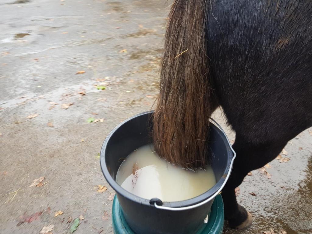 Also hat sie geschwenkt und getunkt und mit Wasser geworfen was das Zeug hielt. Mein Job war stillstehen und nicht bewegen. Kann ich (gegen die entsprechende Bezahlung, die zur Zeit sogar aus lecker Möhrenstücken besteht und die ich mit Nachdruck eingefordert habe durch gelegentliches Kopf zu ihr drehen und sie eindringlich anstarren). Nach einer Weile war sie zufrieden, hat die Tonne weggeräumt und das Wasser weg geschüttet. Vorher war es weiß – nachher eher so was wie Matsche…. hat sich wohl gelohnt! Dann kommt der eklige Part: Ausspülen. Mit kaltem Wasser! An meinem Po! Sehr nah am Gemächt! Das ist fies, Mädchen, dafür brauche ich definitiv mehr Möhren!