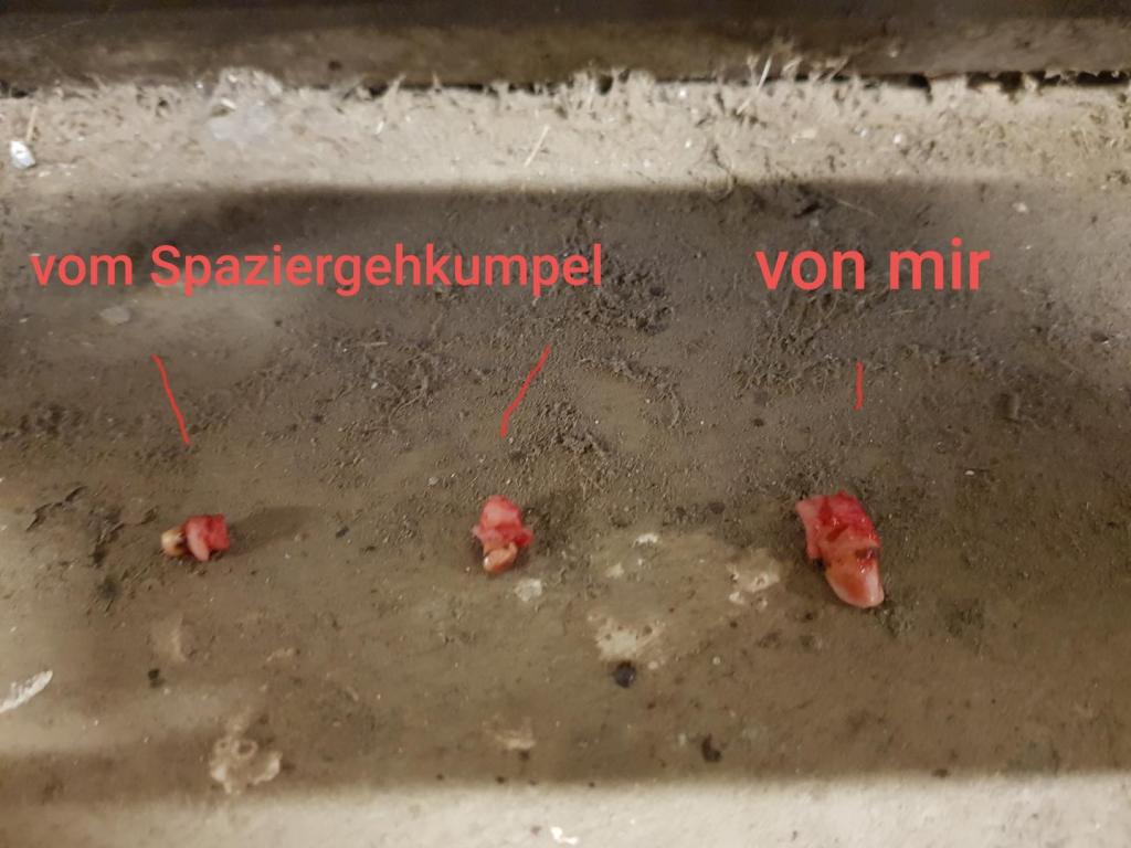….. lange Zeit später bin ich wieder aufgewacht. Puh, ich war ganz schön weggedusselt! Warum fühlt mein Maul sich eigentlich so komisch an? Da hat mein Mädchen es mir gezeigt: die haben mir meinen Wolfszahn raus genommen!