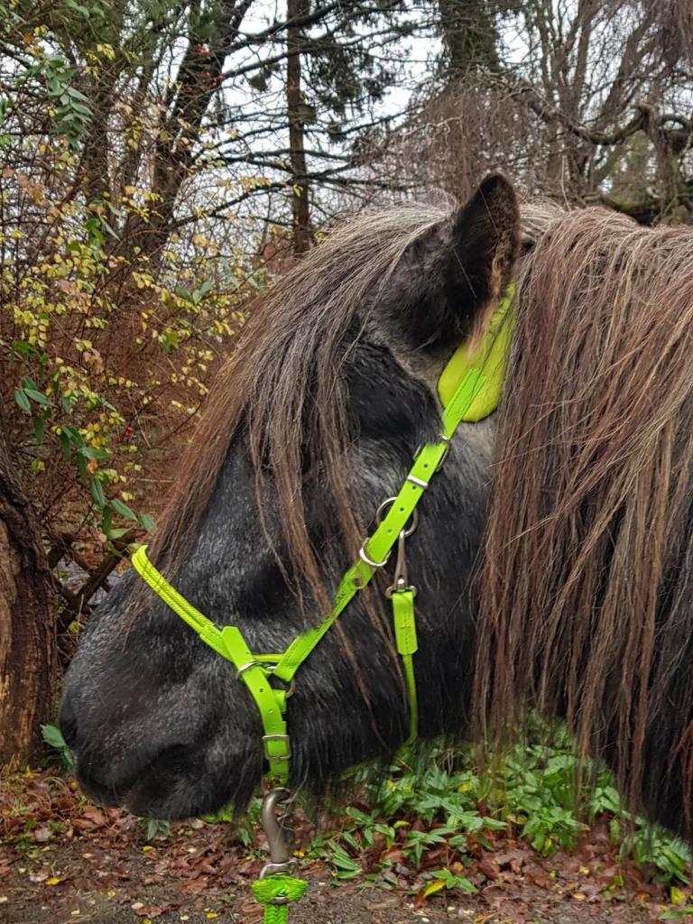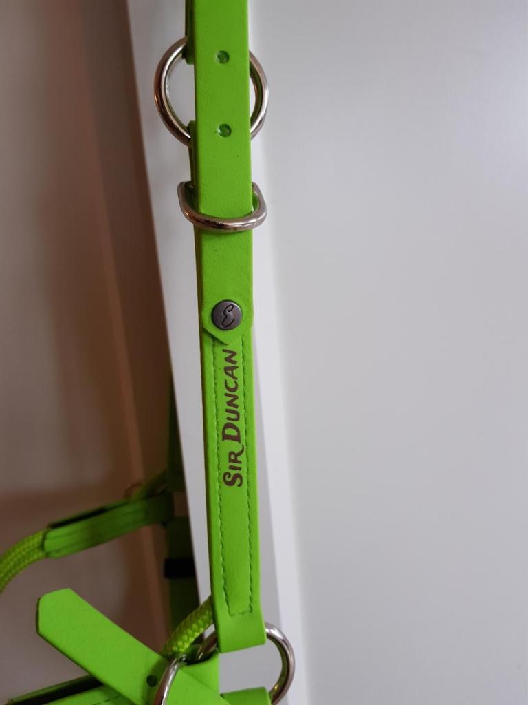 Das extra mühsam ausgemessene Wunderteil. Das kann alles außer kochen und stricken, glaube ich. Alles dran, was ein Ritter wie ich so braucht: weiche Genickpolster, was zum Gebiss-dranhängen, jede Menge Platz zum rein wachsen, Ringe um Zügel dran zu machen (falls mein Mädchen in diesem Leben noch mit dem Reiten anfangen möchte) uuuuuuuuund natürlich mega wichtig: Beschriftung!