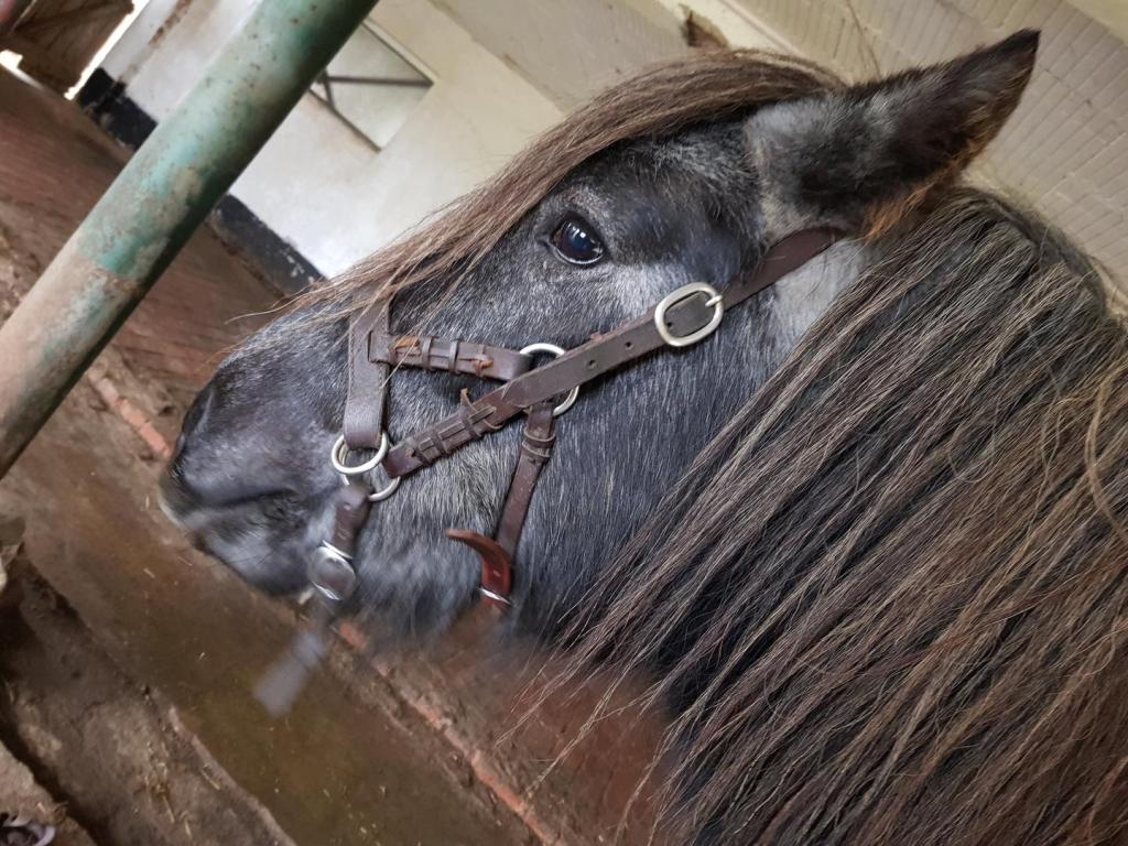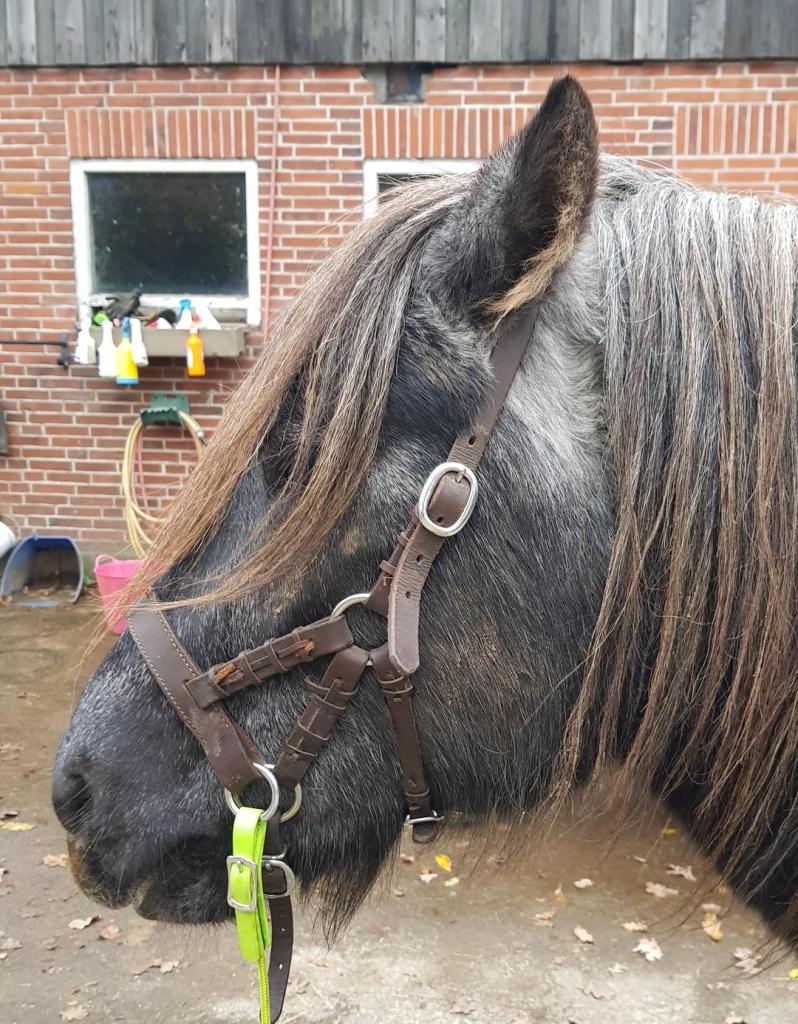 Und dann ist da noch meine Privat-Schneiderin! Wenn mein Kopf mal wieder in Richtungen wächst in die Pferdeköpfe normalerweise nicht so extrem wachsen und deswegen nix so richtig passen will, dann gibt mein Mädchen meine Sachen zur Schneiderin und die macht mir das. So wie damals mein Halfter. Diesmal hat sie mir das Sidepull genäht. Das hat früher Finlay gehört und der hatte nicht so kräftige Ganaschen wie ich. Aber bei mir wurde es schon ganz schön knapp! Jetzt hat sie mir einen neuen Backenriemen da dran gemacht. Wunderbar! So ist alles wieder komfortabel (aber nur wenn mein Mädchen beim Anziehen gut aufpasst, dass mein Bart sich nicht vertüddelt und hinterm Ohr alles richtig sitzt – ich kann das nicht leiden wenn die Haare ziepen oder mir der Genickriemen ins Ohr drückt!).