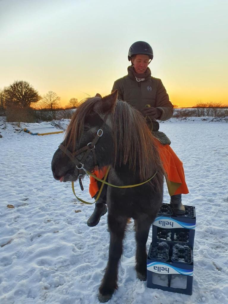 Ich hatte Euch ja erzählt, dass der Mann und ich gemeinsam meinem Mädchen ein Weihnachtsgeschenk gemacht haben. Das war nämlich so: Der Mann und mein Mädchen haben was mit Diego dem Großen und Merlin dem Zauberer auf dem Reitplatz gemacht. Danach war ich dran. Wir haben ein kleines bisschen Bodenarbeit gemacht. Am Ende springt mein Mädchen ja manchmal an mir hoch und liegt mit dem Bauch so quer über meinem Rücken. Der Mann hat das gesehen und hat gesagt, sie soll doch jetzt mal richtig aufsteigen. Er hat meine Zügel genommen und die Aufsteigehilfe hingestellt und mein Mädchen hat sich tatsächlich auf meinen Rücken geschwungen! Sie hat dann so ganz vorsichtig vorne auf meinem Hals gelegen, ist gleich auf der anderen Seite wieder runter und ich habe einen ganzen Sack voll Kekse kassiert.