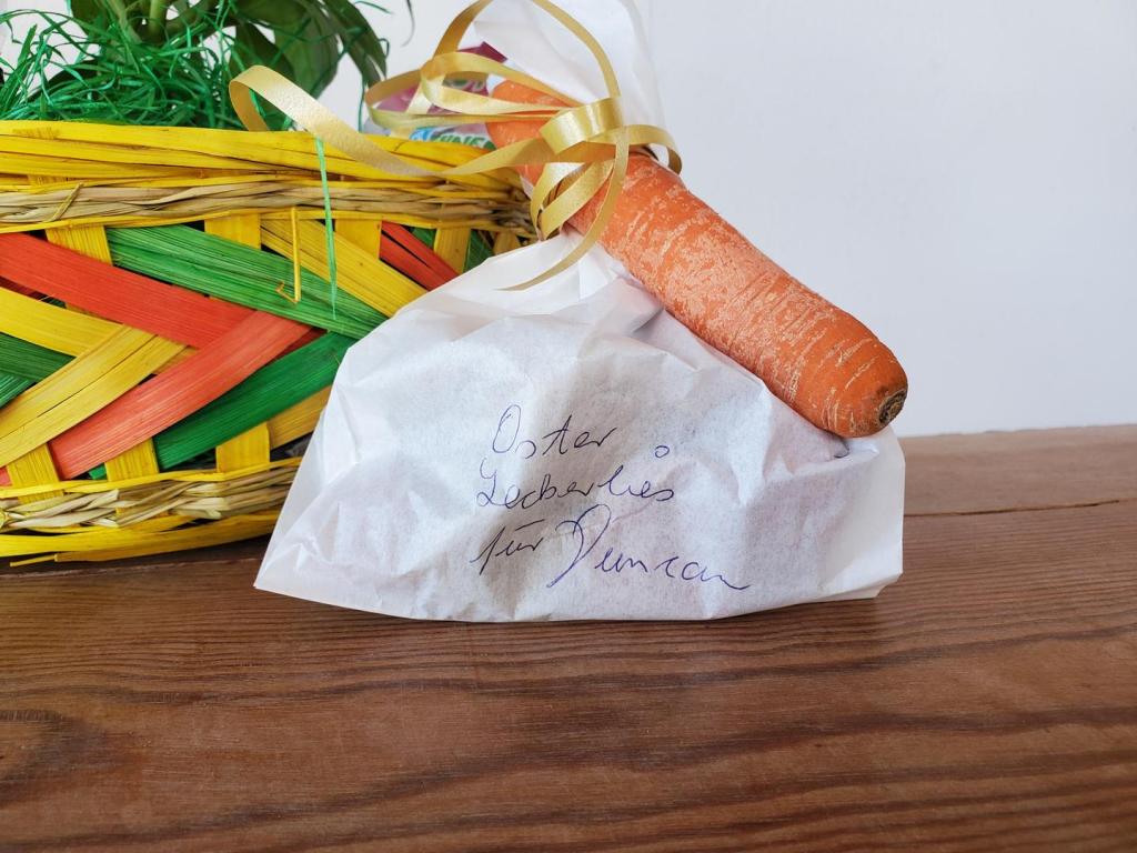 Mein Mädchen hat jetzt schon Osternaschi geschenkt bekommen. Dabei ist es noch zwei Wochen hin bis Ostern! Aber ich will mich nicht beschweren, denn für mich ist auch Naschi dabei und das beste ist: ich habe eine Möhre bekommen! Und die hält keine zwei Wochen. Deswegen hat mein Mädchen gesagt, ich darf sie heute schon haben. Sie hat die Möhre in kleine Scheiben geschnitten und gesagt, dass sie eine tolle Tour geplant hat auf der wir Brücke Level 2 üben können und dass ich die Möhrenscheibe auf der Brücke essen darf.
