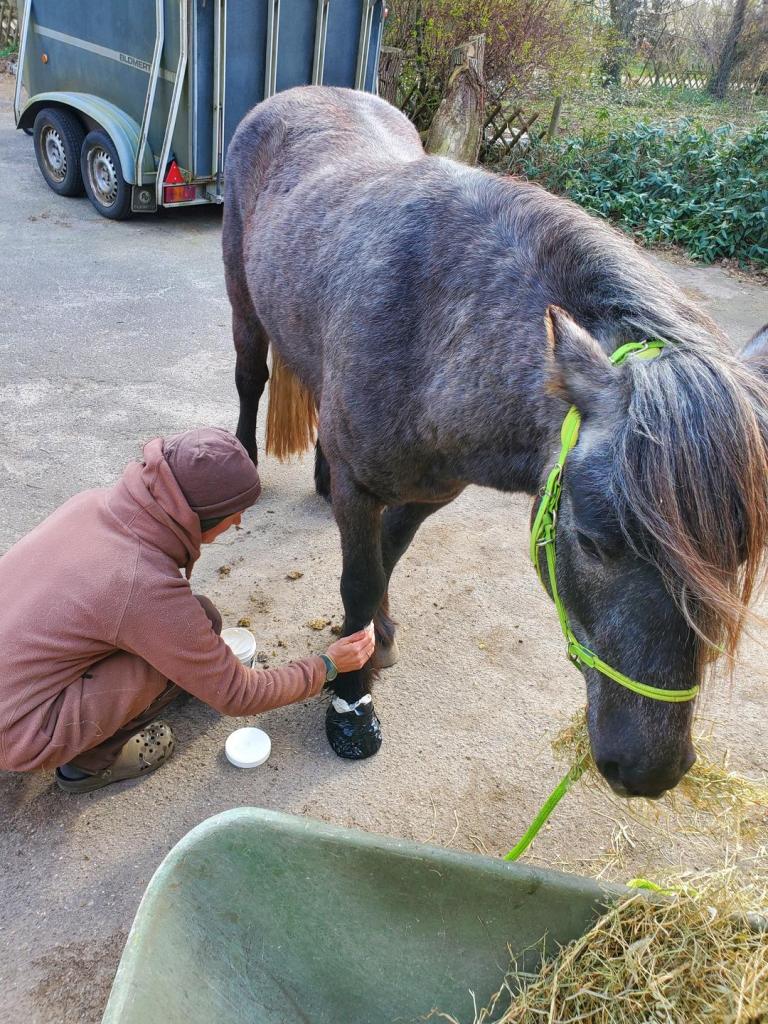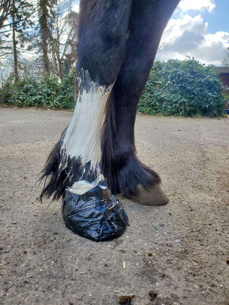 Aber daraus wird nix, denn ich habe einen schlimmen Humpelfuß! Der tut richtig böse weh, ich sage es Euch! Menno. Mein Mädchen und der Mann haben sich das angeschaut und gesagt, dass das wohl ein Hufgeschwür sein wird. Das ist nicht gefährlich oder schlimm, tut aber übelst weh. Da war erst mal eine Runde Mitleid fällig! Dann haben sie mir einen schicken Sauerkrautwickel gemacht, dabei habe ich die Möhrenscheiben abkassiert. Zu guter Letzt hat mein Mädchen mir dann noch kühlende Paste ans Bein geschmiert, damit das nicht anschwillt, das tut es manchmal wenn man ein Hufgeschwür hat, sagt sie. Ich kenn mich da ja nicht aus, ich hatte so was noch nie. Ich weiß nur, dass es doof ist. Aber der Verband ist sehr angenehm, der polstert das ab und mein Huf wird etwas aufgeweicht, das lindert den Druck da drin. Mein Mädchen sagt, in ein paar Tagen ist bestimmt alles schon vorbei. Na, ich werde berichten!
