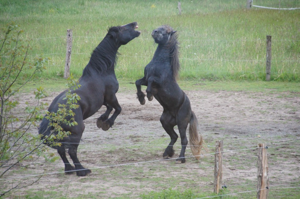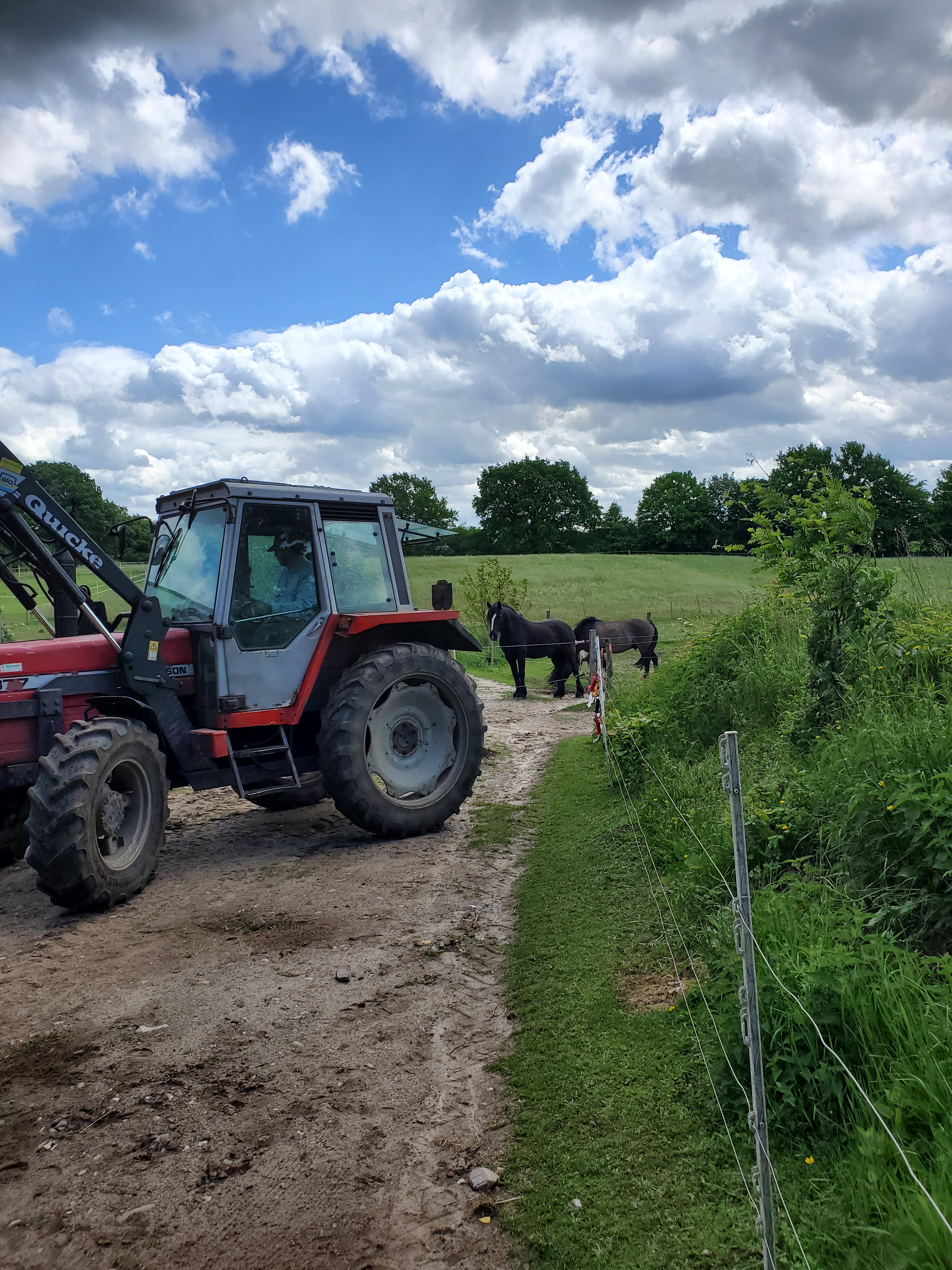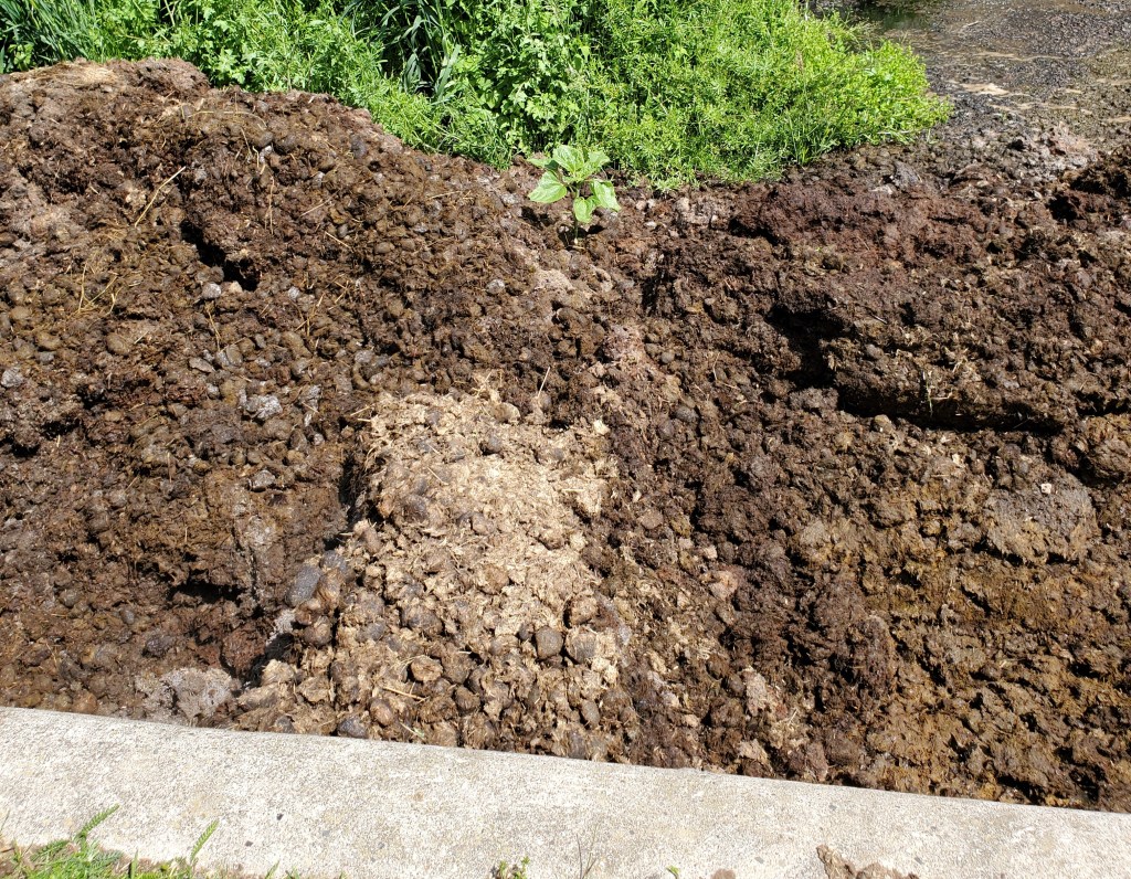Vielleicht war aber wirklich so was wie „Männertag“. Der Mann hat sich nämlich den Trecker vom Nachbarn geliehen und stundenlang damit gespielt. Sagt mein Mädchen. Er sagt, er hat gearbeitet. Und wir Ponys haben zugeschaut. Unter anderem hat er nämlich den Mist umgeschaufelt, damit die Schubkarre wieder leichter auszuleeren ist. Und ganz liebevoll hat er dabei um die Sonnenblume herum geschaufelt, die wir Ponys auf dem Misthaufen gepflanzt haben. Ja, wir Ponys machen das, das habt Ihr richtig gelesen! In unserem Schmatzofatz sind nämlich manchmal Sonnenblumenkerne. Und der eine oder andere davon entwischt unseren Zähnen und landet dann per Äppelhaufen-Express auf dem Mist. Wir haben dieses Jahr fleißig Sonnenblumen gesät und freuen uns schon wie schön das aussehen wird!