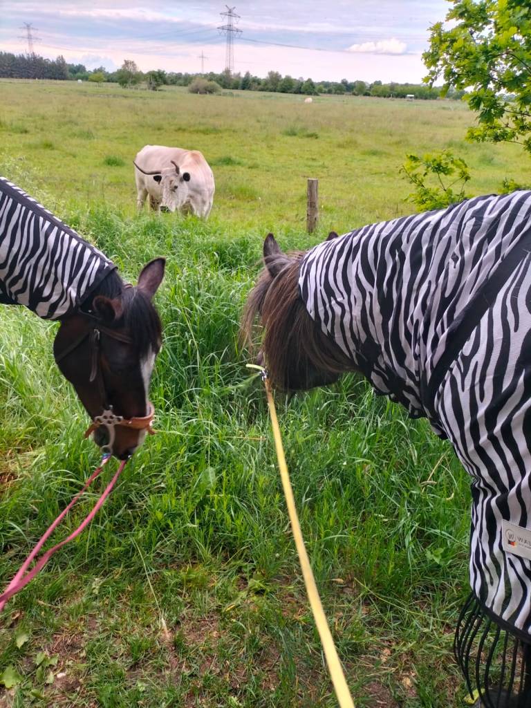 An den nächsten Rinderkoppeln sind unsere beiden Mädchen abgestiegen und zu Fuß gegangen und als da so eine freundliche Kuh mit einem ganz krummen Horn nah am Zaun stand durften wir dort grasen. Weil essen ja immer gegen gruseln hilft.