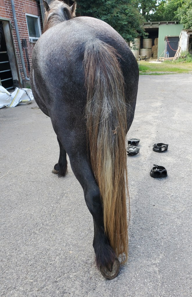 Als wir wieder zu hause waren, hat sie noch meine Dehnübungen mit mir gemacht. Gestern war nämlich wieder Osteopathie angesagt für mich, weil meine Hüfte ganz schief war. Die hat sich wohl beim Wachsen wieder verzogen oder vielleicht habe ich heimlich Quatsch gemacht und bin auf die Nase gefallen, das verrate ich aber nicht. Deswegen hat es auch auf dem Reitplatz nicht klappen wollen mit dem rechts abbiegen, sagt der Mann. Jedenfalls hat mein Mädchen sich geniert, weil sie nicht genug Dehnübungen mit mir gemacht hat, obwohl sie ja weiß, dass sie das machen soll. Tssssstssstsss. Das linke Hinterbein dehnt sie mir nach hinten unten, das rechte nach vorne oben. Das muss jetzt wieder regelmäßig sein! Ich find’s gut. Das ist ganz angenehm, da kann ich mich so rein sinken lassen. Und weil ich das so mag, bin ich dann nach der Übung einfach noch einen Moment so stehen geblieben und hab die linke Beckenseite geschmeidig hängen lassen. Das fand mein Mädchen gut und der Haus- und Hof-Osteopath auch.