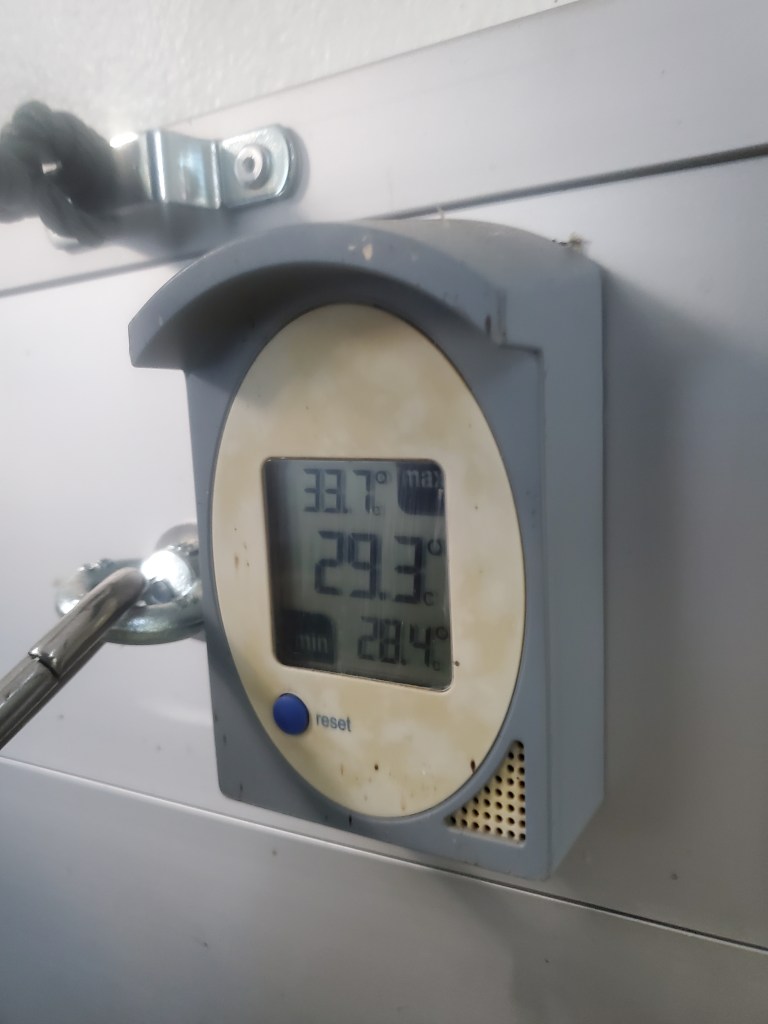 Heute haben wir mein Mädchen sehr glücklich gemacht. Mit einem langweiligen Ausflug! Ach was ist sie putzig, immer redet sie von Abenteuer und dann hat sie es am liebsten langweilig. Also wir sind in die Wackelkiste gestiegen – bei über 30°! Mein Mädchen war nicht sicher, wie warm es da drin wird während der Fahrt, deswegen hat sie ein Thermometer rein gehängt (eher: vom Mann reinhängen lassen). Das Thermometer speichert die höchste Temperatur so kann sie gucken ob wir auch nicht langsam durchgegart werden!