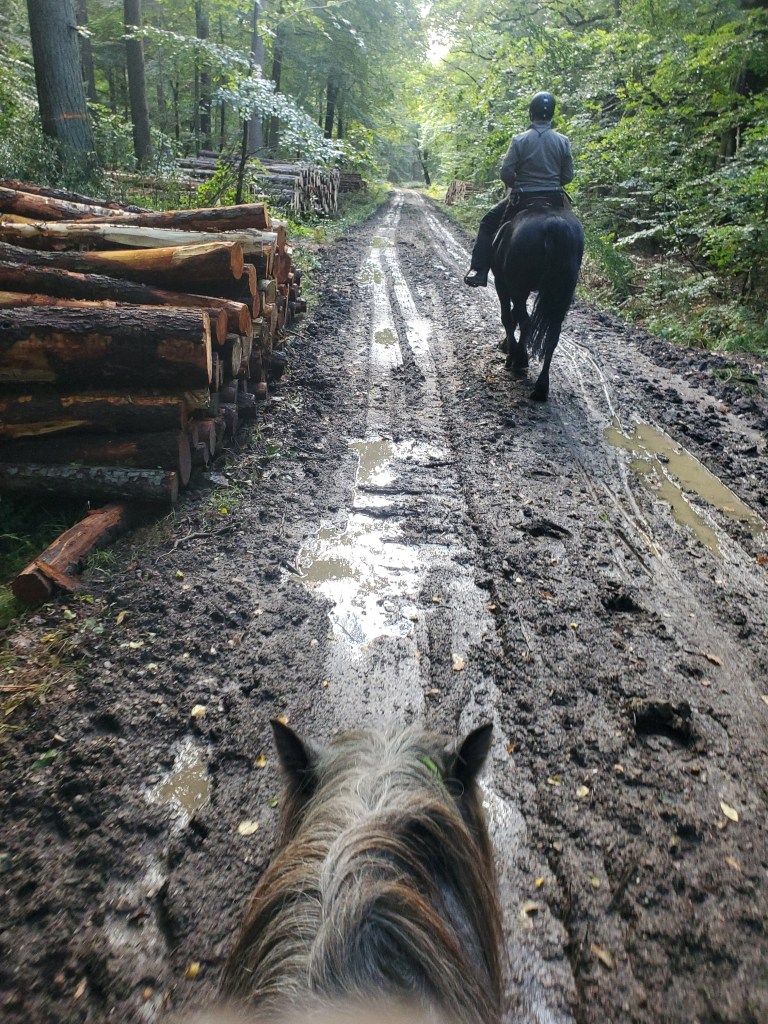 So, jetzt darf ich aber endlich einsteigen, oder? Ich liiiiiiiiiiiebe die Wackelkiste! Im Wald haben Diego und ich dann angemerkt, dass wir es auch voll ok finden würden, erst mal noch da drin zu bleiben und das Heu aufzuessen. Aber daraus wurde nix, so lange wollten die Menschen nicht warten, also mussten wir aussteigen. Na gut, durch den Wald laufen ist ja auch schön. Aber – herrje! – die „bösen Reiter“ hatten den ganzen Weg kaputt geritten, so dass alles total vermatscht war! Zumindest wird das ja immer behauptet. Ich fand ja nicht, dass das nach Hufspuren aussah…. Jedenfalls war das erste Stück des Weges ziemlich nass und rutschig. Ich musste mich ordentlich konzentrieren! Ich meine: zu hause, so alleine für mich, da komme ich klar wenn es rutschig ist. Auch im Turbogalopp und beim Steigen. Aber mit meinem Mädchen auf dem Rücken muss ich ja viel mehr balancieren! Das war ganz schön harte Arbeit. Und die Pfützen haben überhaupt nicht gut geschmeckt. Ein paar habe ich probiert, dann habe ich es aufgegeben. Eklig war das!