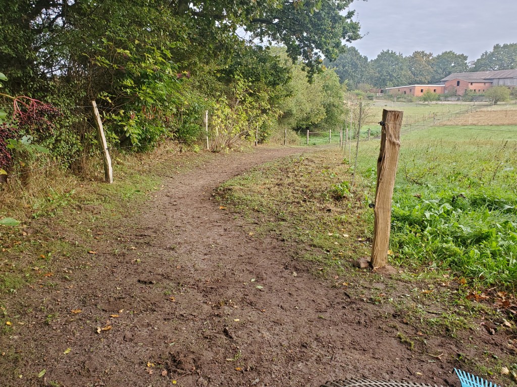 Im Frühling und im Herbst gibt es immer ein paar Tage an denen mein Mädchen das Wetter einfach perfekt findet. Und dann kriegt sie einen Rappel und rennt hier draußen bei uns rum und schneidet den Zaun frei, baut um, lässt den Mann Pfosten setzen und lauter so Zeug. Neulich hat sie sanft an einem Pfosten gerüttelt um zu sehen ob der noch stabil steht, da machte es laut „krrrrrcks“ und sie hat noch lauter geflucht. Direkt am nächsten Tag kam sie mit dem Mann und hat ihm erklärt, wo sie jetzt die neuen Pfosten hin haben will. Das ist immer lustig, weil die Menschen dann erst drei mal aneinander vorbei reden, der Mann ein Loch an der falschen Stelle buddelt, während mein Mädchen zum 238402. mal zurück geht zum Stall um was zu holen, dann kommt sie wieder und sieht das Loch an der falschen Stelle und erklärt dem Mann nochmal wo sie den Pfosten haben will. Dann buddelt er ein neues Loch an der richtigen Stelle. Diesmal haben sie die Engstelle erweitert. Vorher war da so ein „Nadelöhr“. An sich ja kein Problem, aber wir stehen da sehr gern und äppeln da hin und weil es dann so eng war konnten wir nicht um die Äppel herum navigieren sondern haben sie platt getreten. Und das hasst mein Mädchen! Erstens weil sie dann mühsam alles zusammenkratzen muss und zweitens weil sie es gar nicht mag, wenn wir uns Äppel in die Hufe treten. Also hat sie einen kleinen Streifen Weide geopfert und den Weg verbreitert. Gut für uns, denn wir durften den neuen Streifen erst abgrasen und dann konnte ich im Anschluss noch den neuen Zaun sauber frei schneiden (ist ja auch wichtig!) dafür bin ich nämlich zuständig. Hat mein großer Bruder auch immer gemacht, sagt mein Mädchen.