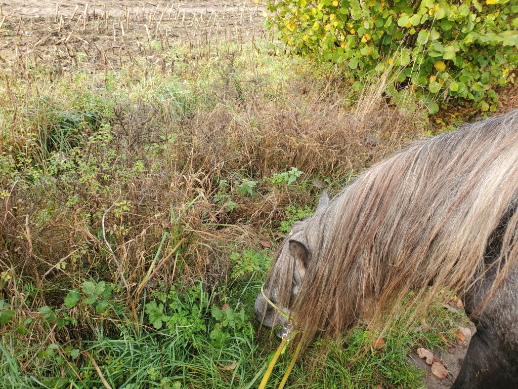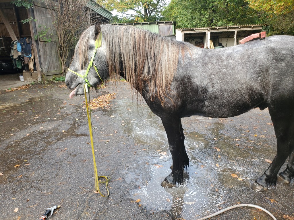 Trotzdem fand mein Mädchen das schön und ihre Wange hat auch schon nicht mehr so weh getan. Also ist sie wieder aufgestiegen und ich hab sie den Berg runter getragen. An der Landstraße wollte sie dann aber doch wieder zu Fuß gehen, weil der Schreck ihr noch so in den Gliedern saß. Anstatt danach links nach hause zu gehen, sind wir noch rechts abgebogen und „hinten rum“ nach hause geritten. Da sind wir auch noch ein bisschen getrabt. Ich war schon ein etwas kopfmüde und hab auch ordentlich geschwitzt, weil wir Ponys ja schon Winterfell tragen, das Wetter aber noch super warm ist. Deswegen gab es zu hause eine kleine Dusche. Hat mir auch gefallen (tut es ja nicht immer). Danach hab ich ein schönes Sandbad genommen und den Rest vom Sonntag verbummelt.