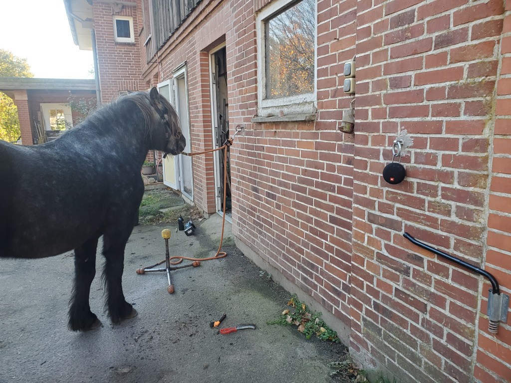 Damit uns bei dem ganzen Pflegeprogramm nicht so fad wird, hat sie heute Musik laufen lassen. Könnt Ihr leider auf dem Foto nicht hören, aber der kleine runde Kasten an der Wand macht schön Musik. Ich hab aber nicht verraten, was mir am besten gefällt. (War auch nix schottisches dabei). Und weil ich so lange nicht angebunden gestanden hab, haben wir das nebenbei auch mal wieder geübt. Normalerweise werde ich ja nie angebunden, mein Mädchen sagt „waaaaaarte“ und dann steh ich da wie angewurzelt bis sie wieder kommt und den Keks liefert. Wozu dann anbinden? Ist aber eine notwendige Fähigkeit sagt sie, also machen wir es ab und zu. Egal, hauptsache ich kriege trotzdem genauso viele Kekse!