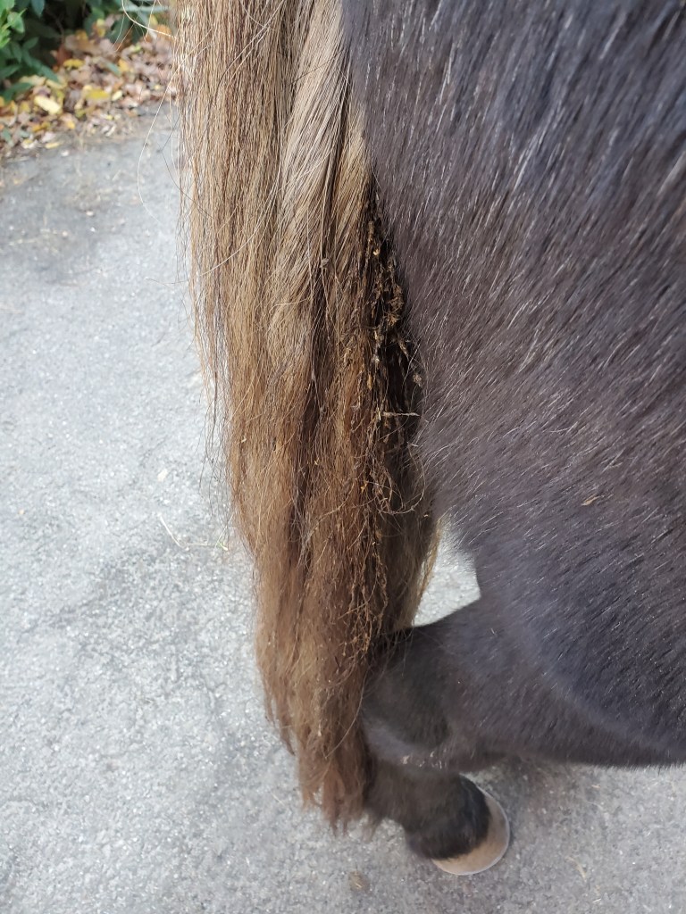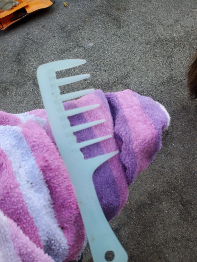 Aber manchmal geht sie doch bei. Wenn nachts die Feen auf mir geritten sind und sich Steigbügel in mein Haar geknotet haben zum Beispiel. Dann macht sie das ganz vorsichtig mit den Händen raus. Und hinten rum bin ich manchmal nicht ganz so reinlich. Mein Mädchen meckert dann immer, dass ich zu faul bin, meinen Schweif beim Äppeln hoch genug zu heben dass er nicht dreckig wird. Ja, der ist halt schwer, bei den vielen schönen Haaren! Naja dann hab ich da so dreckige Strähnen, da findet sie dann schon mal etwas Pflege angesagt. Erst einsprühen, dann kämmen. Dafür hat sie sich ein Spezialwerkzeug gebastelt: den grobzinkigsten Kamm gekauft den sie finden konnte und dann noch jede zweite Zinke raus gefräst. So nimmt sie dann eine Strähne in die Hand, hält gut fest und fängt am unteren Ende an zu kämmen. Das geht richtig schwer, aber wenn sie oben gut fest hält, ziept es nicht, dann kann ich das aushalten. Allzu lang habe ich da trotzdem keine Lust drauf, ich bin eben einfach nicht so der Tüddeltyp. Das versteht sie gut, weil sie auch nicht gern hat wenn jemand an ihr rumtüddelt und deswegen macht sie nur das nötigste – also das was sie für das nötigste hält.