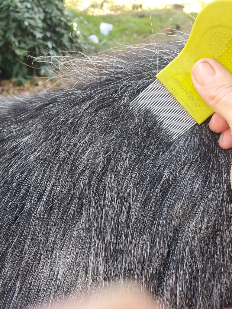 Heute hat sie auch wieder den Läusekamm geschwungen. Weil ich in den letzten Wintern ja so ein klitzekleines Krabbelproblem in meiner Rüstung hatte. Das will sie scharf im Auge behalten, nicht dass das wieder los geht! Zum Glück kämmt sie mich damit nicht komplett, das würde ja ewig dauern! Sie kennt ja die einschlägigen Stellen und schaut da mal nach. Gefunden hat sie nix, Gott sei Dank!