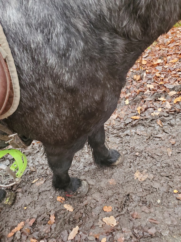 Dann sind wir in Ruhe weiter geritten. Als es schon gegen Ende ging, sind wir noch ein Stück getrabt. Plötzlich meinte mein Mädchen, ich würde ja wohl humpeln oder was? Sie hat mir gesagt, ich soll Schritt gehen und zum Mann, ob ich wohl einen Stein im Schuh hätte oder so. Schaut der Mann an mir runter und sagt „nö, dem fehlt ein Schuh!“ Ach herrje. Und zurück marsch marsch. Da hatten wir Ponys aber gar keine Lust. Mein Mädchen ist abgestiegen und hat mich geführt, während Diego und der Mann getrabt sind, um schnell nach dem Schuh zu suchen. Sie waren dann bald außer Sichtweite, aber anscheinend waren sie zu schnell getrabt, denn sie haben den Schuh übersehen. Den hat mein Mädchen dann entdeckt. Sie hat den Mann angerufen, er soll zurück kommen. Schuh wieder an, umdrehen und ab Richtung Wackelkiste. Damit es sich nicht so hinzieht, sind wir noch ein ganzes Stück getrabt. Ich war schon echt müde, aber mein Mädchen sagt, das hat sie von meinem großen Bruder gelernt: Schritt gehen weil man müde ist, dauert viel zu lang und man wird nur immer müder. Lieber die Pobacken zusammen kneifen und noch so viel wie möglich traben, dann ist man viel schneller am Ziel (ich bin zur Zeit im Trab ungefähr doppelt so schnell wie im Schritt).
