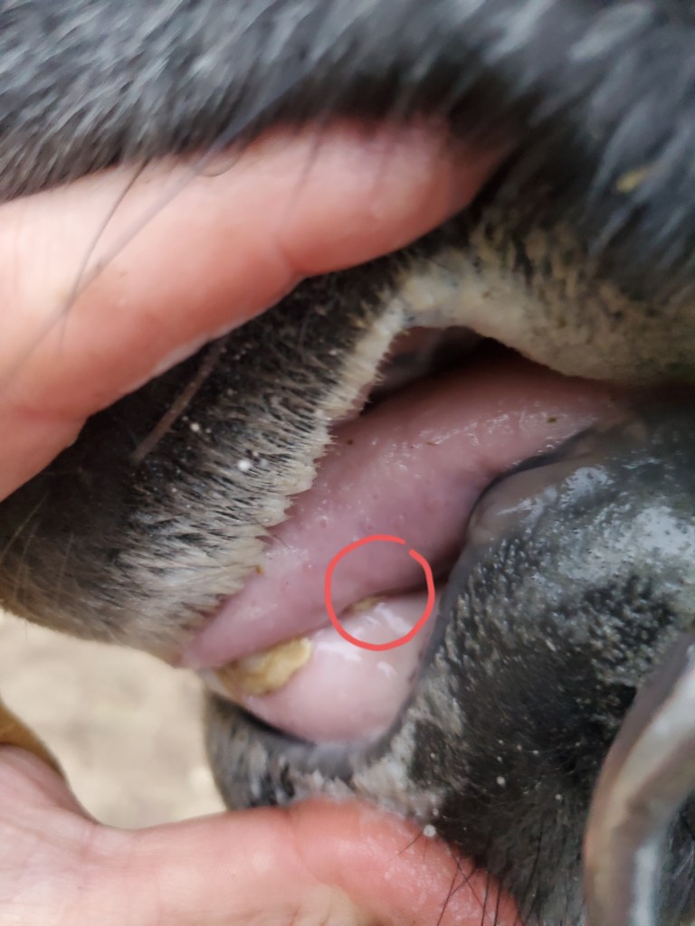 Nachdem ich meine Milchzähne jetzt alle ausgetauscht und mir auch noch ein paar neue Backenzähne zugelegt habe, bin ich jetzt dabei, mir meine allerletzten Zähne wachsen zu lassen: die Hengstzähne. Das ist ja schon wieder ein verwirrender Begriff, denn den haben auch Wallache und manchmal sogar Stuten! Aber bei mir ist der Name ja passend also was solls. Noch sind meine Hengstzähne mini-klein bzw zwei davon sind nur unterm Zahnfleisch zu fühlen, die wollen noch raus kommen (deswegen bin ich wohl wieder mal etwas maulig, sagt mein Mädchen). Sie wollte den größten der kleinen Stummelchen für Euch fotografieren, aber es ist kompliziert, mir das Maul aufzuhalten, ein Foto zu machen und dann noch meine Zunge beiseite zu schieben. Deswegen müsst ihr eure Fantasie bemühen, dann findet ihr den zwergen-Zahn.