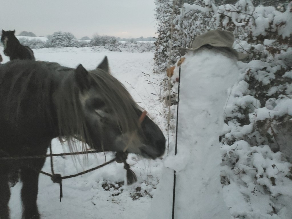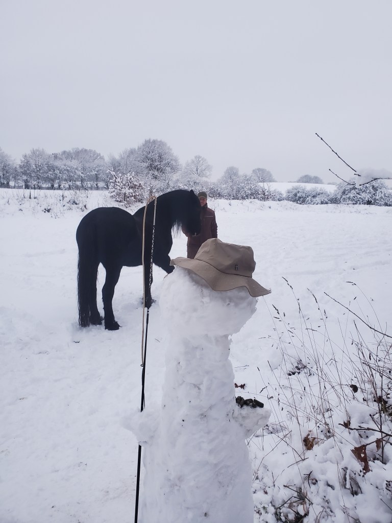 Dieses Wochenende haben wir einen echten Reitmeister hier! Mein Mädchen sagt, er heißt Hugo. Er steht an der Ecke unseres Reitplatzes und schaut uns zu, wie wir Dinge üben. Er hat eine Peitsche dabei, die er aber nie benutzt, und Leckerlies in der Hand. Ein sehr schweigsamer Geselle ist das! Aber er gibt sehr guten Unterricht. Weil er seine Schüler selbst die Lösung erarbeiten lässt, ist das besonders nachhaltig. Viel besser als wenn einem alles vorgesagt wird. Wenn wir ihn was fragen, dann schweigt er, aber er lächelt dabei so nett, dass uns die Antwort selbst einfällt. Mein Mädchen sagt, wir müssen es ausnutzen, dass er hier ist, denn er hat nur dieses eine Wochenende Zeit für uns. Also üben wir fleißig auf dem verschneiten Reitplatz das reiten – weil mein Mädchen nicht zu Fuß durch den Schnee neben mir her stapfen möchte! Ob ich durch den Schnee stapfen möchte, werde ich nicht gefragt, oder? Aber eigentlich mache ich das ja gern. So lange es nicht zu rutschig wird. Und – ihr ahnt es bereits – so lange die Keksrate stimmt. Da mein Mädchen ja findet, dass ich das alles spektakulär gut mache, stimmt sie übrigens immer.