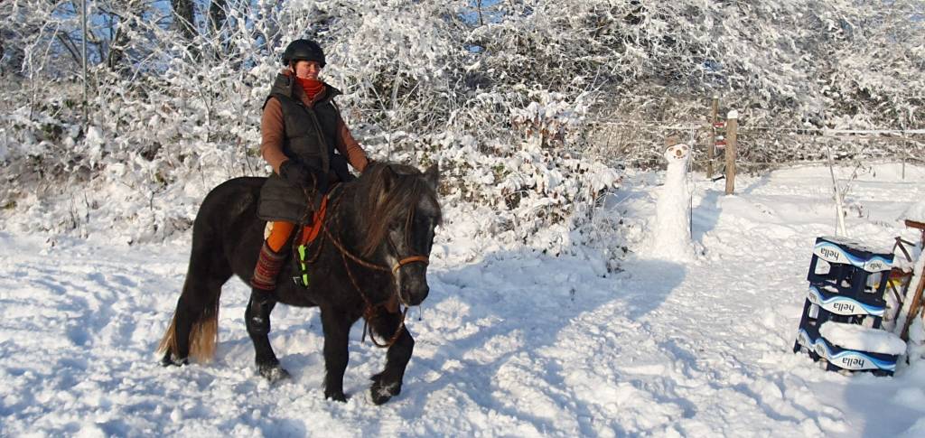 Erst lief alles ganz fein. Dann haben mein Mädchen und der Mann sich beraten, während ich so herum stand. Mein Mädchen auf meinem Rücken. Und da war plötzlich ein Ungeheuer im Schnee! Der Mann hat es auch gesehen, aber er meint, es war nur eine Ratte oder ein Vogel, jedenfalls kein Ungeheuer. Naja, wenn wir Ponys eins wissen, dann dass ihr Menschen von Ungeheuern keine Ahnung habt. Ich bin lieber auf Nummer sicher gegangen, habe auf dem Absatz kehrt gemacht und bin los. In der Drehung hat mein Mädchen kurz das Gleichgewicht verloren, aber sich noch schnell mit einem Oberschenkel gerettet und da war ich dann auch schon wieder stehen geblieben, weil mir auffiel, dass es vielleicht doch kein Ungeheuer war. Mein Mädchen war ganz fröhlich, weil sie immer etwas Angst hatte vor so einer fiesen Drehung. Ich bin ja nunmal klein und wendig (quadratisch halt!) und sie hatte Angst, dass sie einfach nicht mitkommt, wenn ich mal fix die andere Richtung einschlage. Jetzt hat sie diese Angst nicht mehr, weil sie ja gemerkt hat, dass sie doch ganz gut oben bleibt und ich sie nicht verliere.