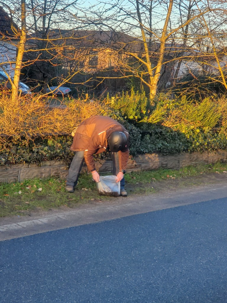 Dann sind wir umgedreht und haben uns auf den Heimweg gemacht. Im Dorf mussten wir nochmal anhalten, denn auf dem Hinweg hatte ich da eine Hinterlassenschaft platziert, die wollten die Menschen noch einsammeln. Ab damit in die Tüte und wer musste es wieder schleppen? Naja, nur durchs Dorf bis zur Aufsteigebank, dort hat mein Mädchen die Tüte am Feldrand entleert.