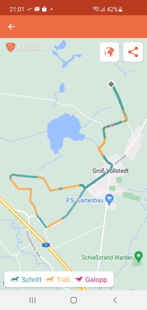 Hier könnt ihr sehen, wo wir lang geritten sind und wie schnell wir waren: das grüne ist Schritt, das orangene ist Trab.