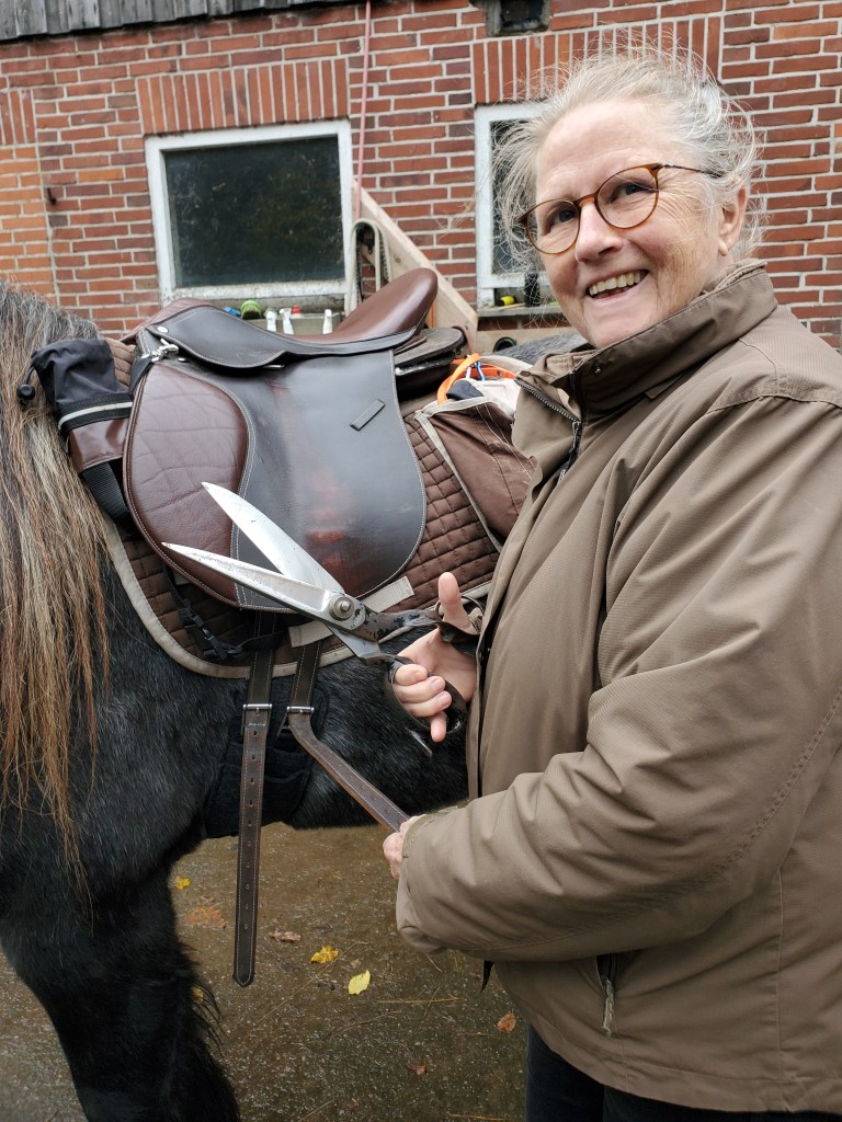 Mein Mädchen will ja immer, dass ich es bequem habe bei der Arbeit. Deswegen sorgt sie dafür, dass ich gute, passende Klamotten hab. Das ging schon früh los, da hat sie mein Halfter umnähen lassen, damit es mich nicht kneift. Später habe ich dann meine grüne Universalklamotte für alle Gelegenheiten bekommen. Noch später fiel meinem Mädchen auf, dass der Gurt vom Reitpad blöde sitzt, auch da musste mal wieder meine persönliche Haus- und Hofschneiderin ran. Dann stellte sich heraus, dass Gurte bei mir grundsätzlich gar nicht so gut sitzen: wenn die vordere Strupfe straff ist, hängt die hintere durch und umgekehrt. Das ist ja nun nicht Sinn der Sache! Also was tut mein besorgtes Mädchen? Richtig: sie aktiviert die Haus- und Hofschneiderin. Und die hat wieder mal gezaubert. Dann kam sie höchstpersönlich zur Anprobe vorbei. Hatte ihre groooooße Schneiderschere mit und hat alles passend gemacht.