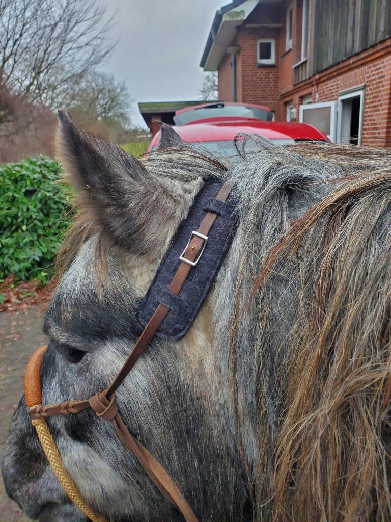 Außerdem hat sie gleich noch mehr für mich genäht, weil sie doch gerade so in Schwung war! Mein Mädchen hatte nämlich Sorge, dass es mich stört, wenn das Bosal mit dem schmalen Riemen so direkt hinterm Ohr sitzt. Also wollte sie gern so ähnliche Polster wie sie an meiner Universalzäumung dran sind. Das hat auch den Vorteil, dass zwischen den beiden Polstern genug Platz für mein Wallehaar ist. Und auch diese schnieken Dinger sind jetzt fertig und sitzen einfach fantastisch! Zu unserer beider Überraschung ist sogar das Anziehen des Bosals einfacher geworden damit. So habe ich es jetzt auf jeden Fall ganz gemütlich beim Arbeiten und so soll das ja auch sein – besonders wo mein Arbeitspensum ja jetzt beträchtlich steigt.