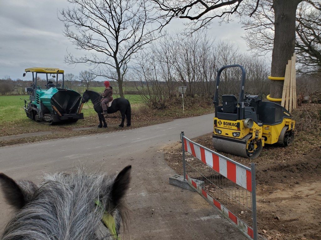 Dann hab ich erst kapiert was die da machen: die erneuern unsere Galoppstrecke! Mein Mädchen meint, das ist der Radweg und nur weil wir da unsere ersten Galoppversuche illegaler weise getätigt haben (natürlich nur als weit und breit niemand zu sehen war), ist das noch lange nicht „unsere Galoppstrecke“. Das sehe ich aber anders! Und habe gleich mal angemerkt, dass ich das mit dem Schritt gehen voll blöde finde. Naja, keine Chance.
