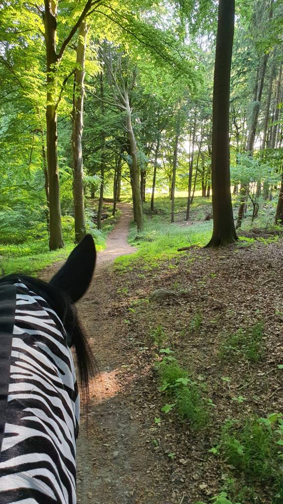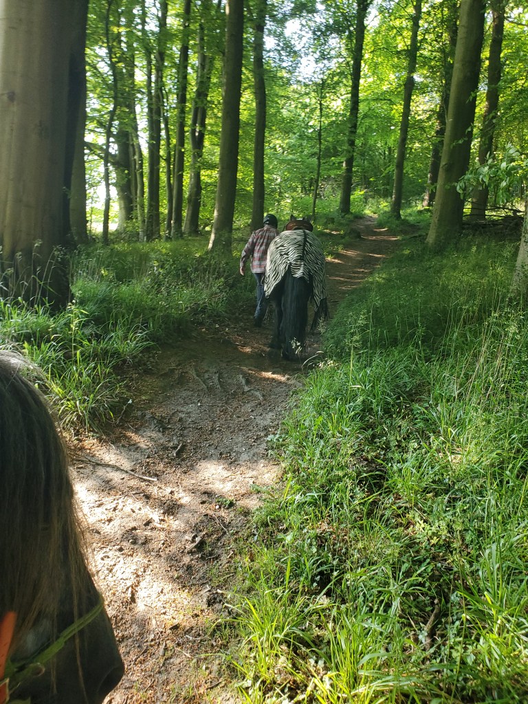 Den steilen Berg hoch steigen die Menschen immer ab. Aber danach sind sie wieder aufgestiegen und es ging den schmalen Pfad durch den Wald entlang. Plötzlich haben wir gesehen, dass vor uns ein Baum quer liegt! Zu hoch um drüber zu klettern und zu niedrig um drunter her zu reiten. Wir sind trotzdem erst den kleinen Berg zu dem Baum hoch gegangen, weil die Menschen gehofft haben, dass man da irgendwie außen rum kommt. Ging aber nicht. Also wieder umdrehen. Und da ging das echt steil bergab! Mein Mädchen hatte Sorge, ob ich das mit ihr auf dem Rücken schaffe. Aber klar, ich kann sowas jetzt! Und weil sie so stolz war, musste sie dann unten direkt noch ein Foto machen. So steil bergab hab ich sie getragen!
