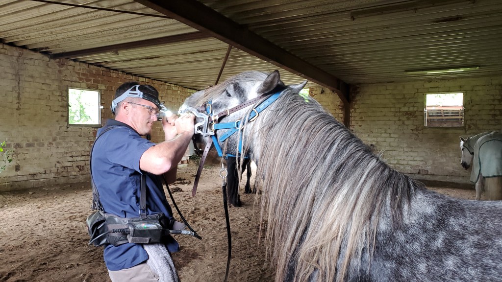 Nachdem er all diese netten Dinge über mich gesagt hatte, war ich bereit, mitzumachen. Er hat er sich meine Zähne angeschaut und gesagt, dass alles ok ist, nur ein paar scharfe Kanten müssen weg. Die hat er mir dann weg geraspelt und schon waren wir fertig. Jetzt kann ich wieder schön gleichmäßig auf beiden Seiten kauen. Das ist auch wichtig, weil das Gras jetzt langsam härter wird und gut zermahlen werden muss.