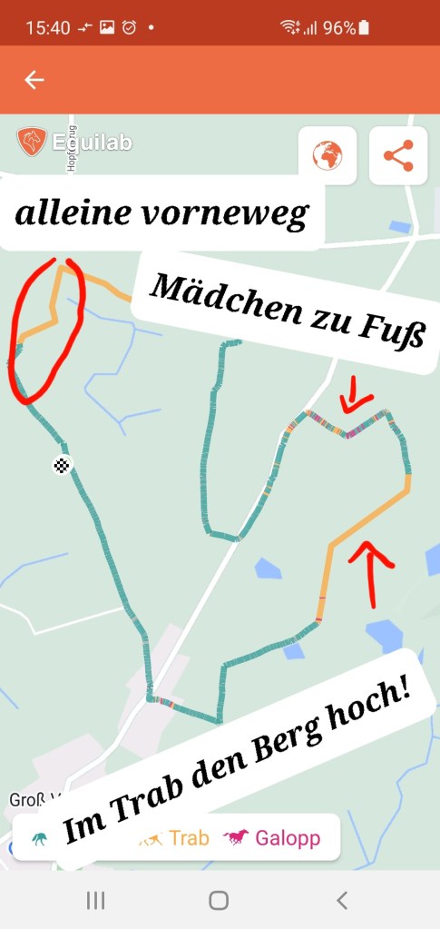 Auf dem Heimweg sind wir dann nochmal rechts abgebogen um den schönen Grasweg zu reiten. Den sind wir noch fein durchgetrabt und mein Mädchen war wieder ganz entzückt. Da geht es nämlich auch immer bergauf und bergab und die eine oder andere Wurzel liegt da auch herum, aber ich passe immer gut auf meine Füße auf und stolpere nicht, das findet sie toll. Am Ende des Grasweges hat Diego dann durchpariert und mein Mädchen und ich sind noch weiter getrabt, so dass wir wieder allein vorne weg waren. Ich bin mir da immer noch nicht so sicher und gehe etwas langsamer voran als normal. Aber mein Mädchen sagt, Übung macht den Meister und ich werde mich da schon noch dran gewöhnen und das hinkriegen. Sie hat schon davon geträumt, dass wir einmal als erste auf dem Hof ankommen, da hörten wir von hinten „padadamm, padadamm“! Kam Diego angaloppiert! Der Mann sagte, er hatte so Lust mal zu galoppieren. Hat bei uns kurz durchpariert und ist dann einfach nochmal angaloppiert. Ich bin weiter Schritt gegangen (zack! Mädchen stolz, weil ich nicht hinterher rasen wollte). Tja, Ende vom Lied: Diego war WIEDER als erster zu hause! Ist mir aber egal. Ich wäre auch gern noch den schönen Weg gegenüber rein gegangen, wo lecker Gras wächst.