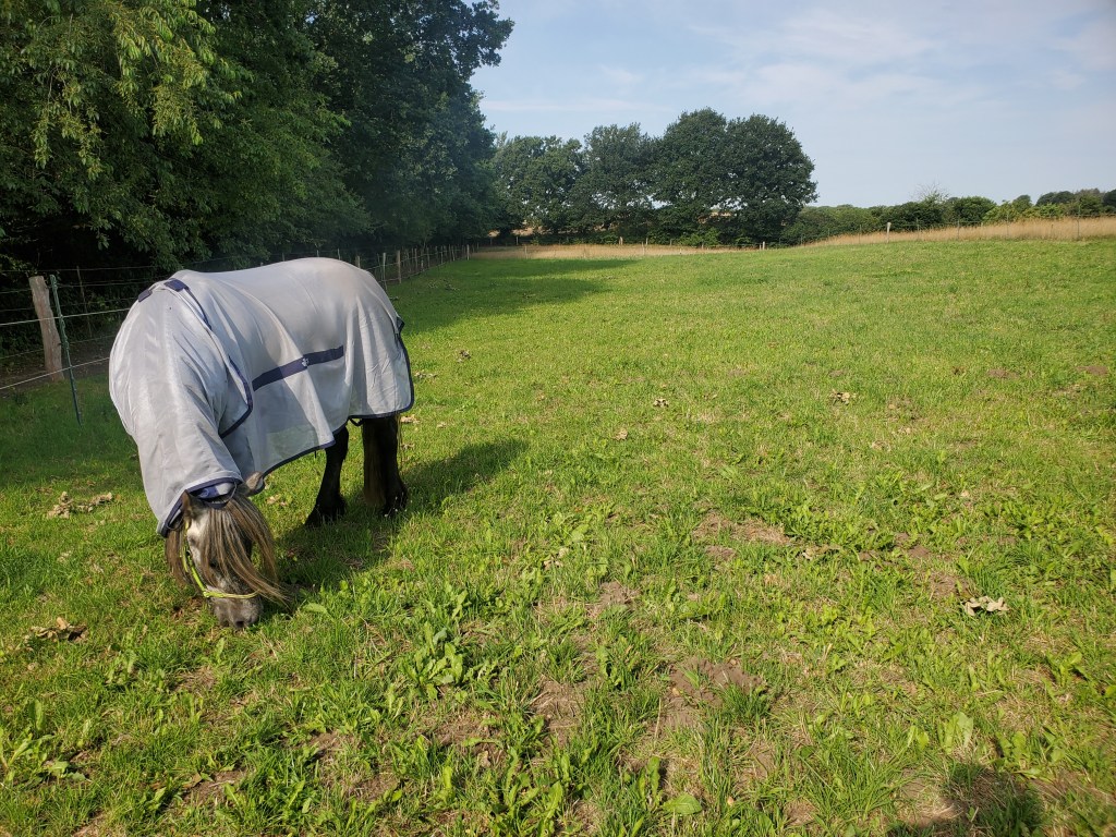 Dazu gehen wir jetzt wieder auf unseren „Sommerreitplatz“. Haben wir geübt, können wir beide jetzt auch wieder allein. Ich kriege meine Fliegenrüstung an, damit ich nicht wieder losflitze wegen der Viecher.