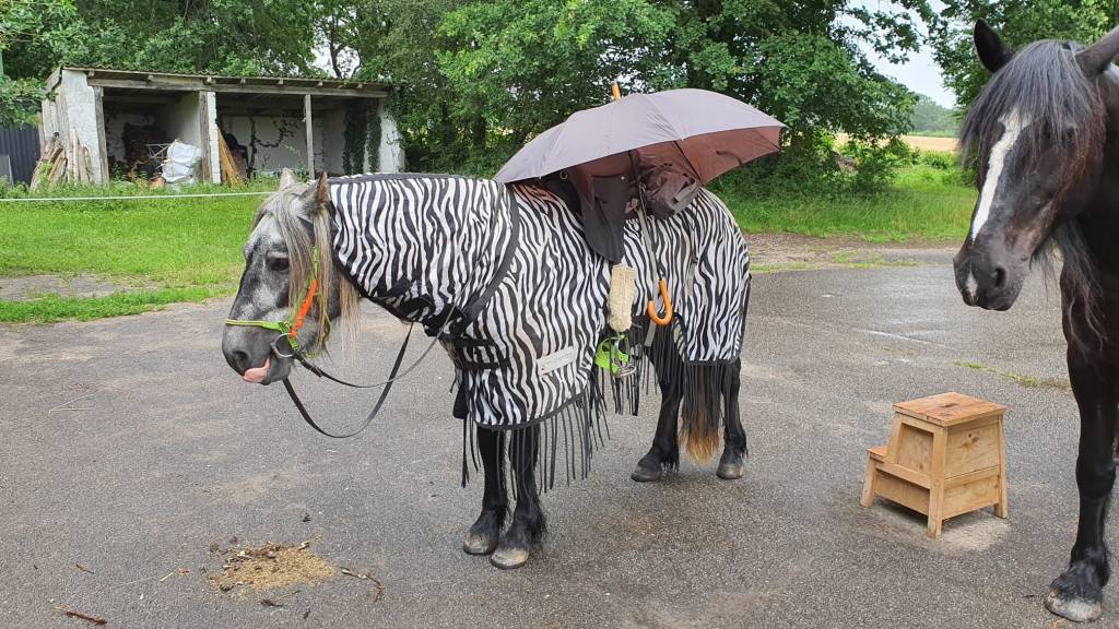 Dann hat sie beschlossen, mit dem Regenschirm in der Hand aufzusteigen. Na klar, das hat sie wieder in äußerster Eleganz hinbekommen. Nicht. Aber ich kenne sie ja und ich bin ein sehr geduldiges Pony…. Aufs Losreiten hat sie dann verzichtet. Weil ich das alles so toll gemacht hatte und sie fand, ich sollte jetzt Feierabend machen.