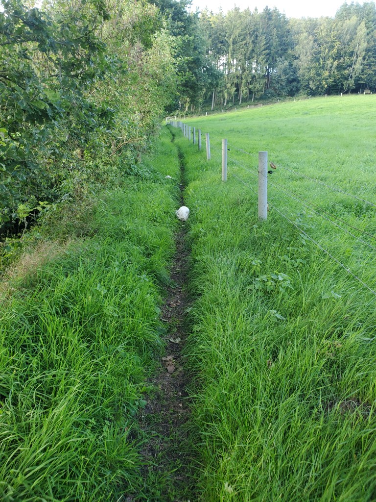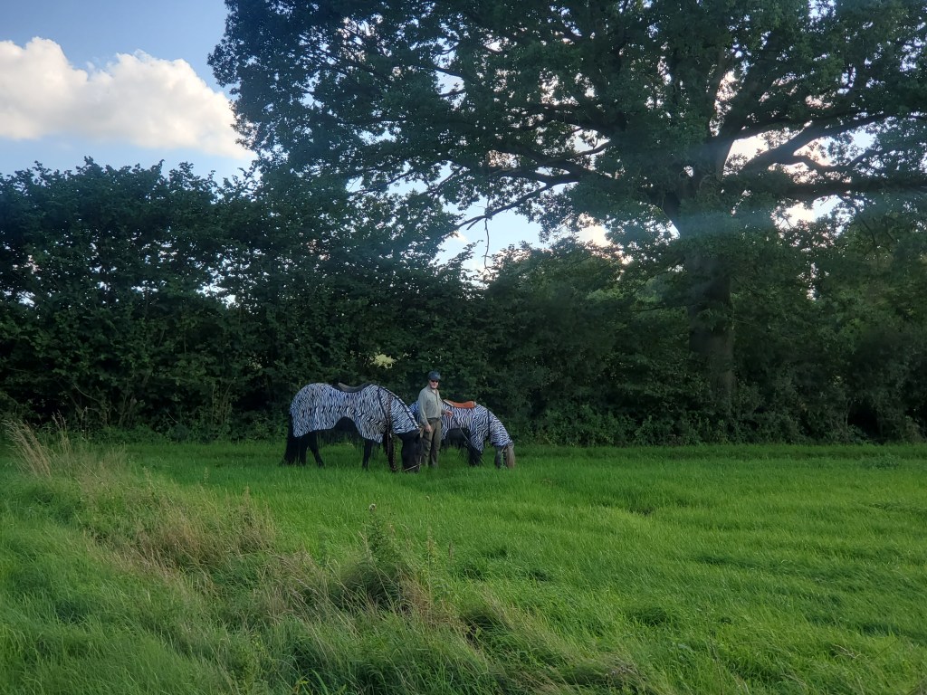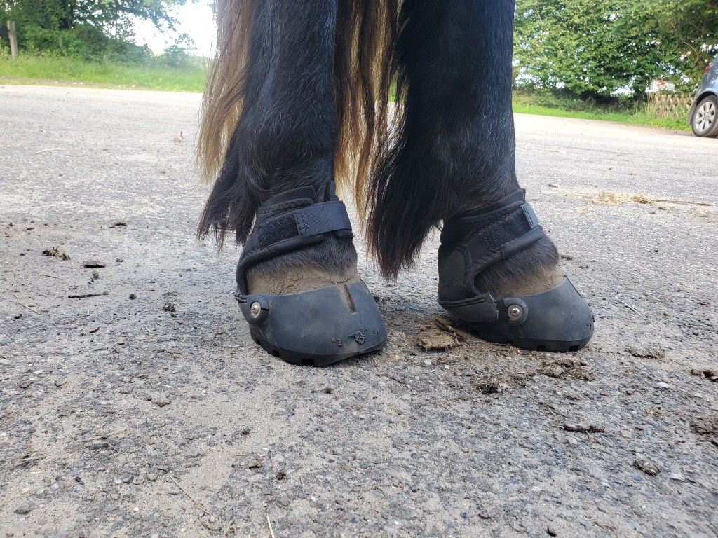 Mein Mädchen ist etwas matschig, weil so fieses Wetter war. Gestern heiß und schwül und in der Nacht sagt sie, hat sie im Dampfbad geschlafen. Warmer Nebel! Na jedenfalls war ihr da heute nicht nach großem Ausflug. Wir haben also ganz gemütlich die Hausrunde gedreht. Ohne Sattel, nur mit Pad. Dafür mit neuen Schuhen für meine Hinterhufe zum ausprobieren. Geliehen natürlich, weil mein Mädchen ja so aufs Ausleihen steht. Sitzen gut! Aber es kann sein dass ich sie eine Nummer kleiner brauche, wenn mein Mädchen mir die Hufe wieder schick gemacht hat. Das sehen wir dann, hat sie gesagt.