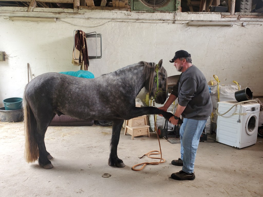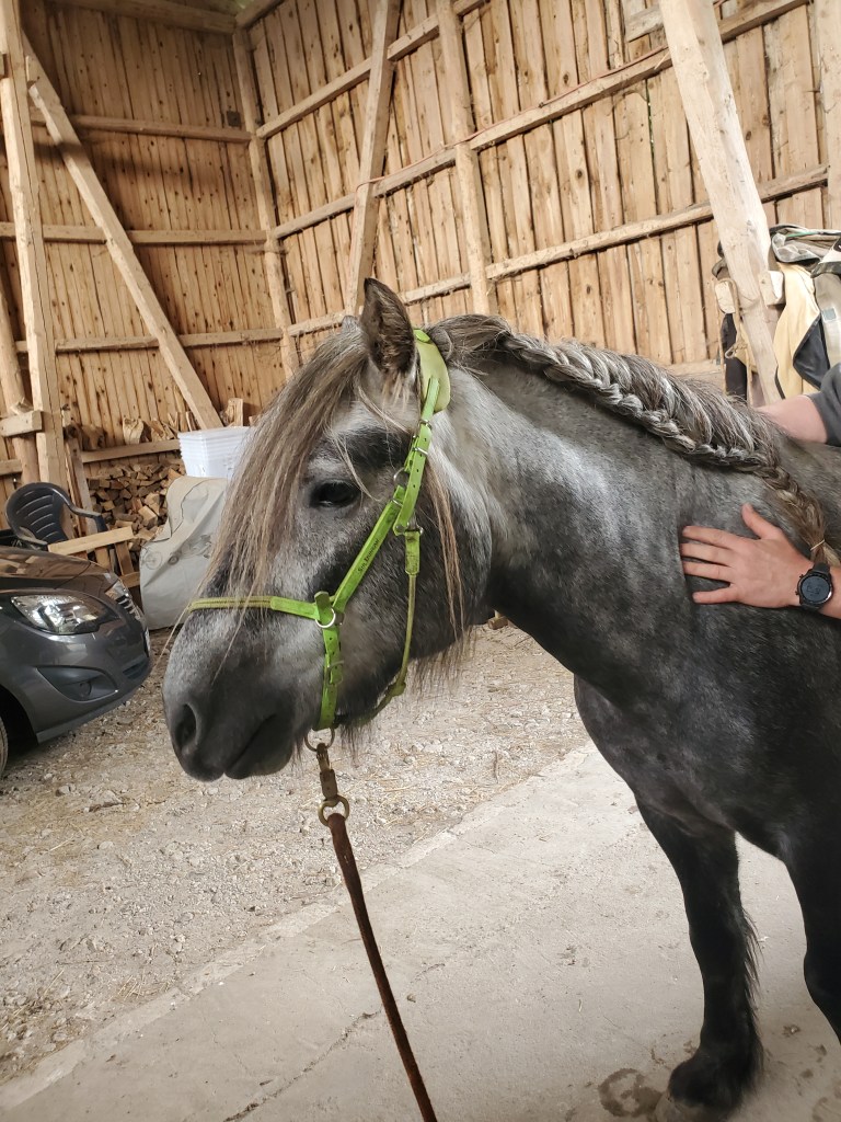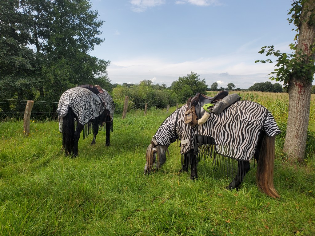 Aber vorher alles anziehen. Hufschuhe! Da hat mein Mädchen geflucht und mit meinen vorderen Schuhen gekämpft, weil die einfach nicht auf meine Hufe gehen wollten. Schließlich wurde es ihr zu bunt, sie hat die Raspelmaschine zur Hand genommen, meine Hufe wieder besser in Form gebracht und dann ging es. Sie sagt, es ist gut, dass ich diese Schuhe hab, die zwingen sie dazu, meine Hufe immer tiptop in Form zu halten. Meine Hufe wachsen nämlich sonst zu viel nach vorn und das ist nicht gut.