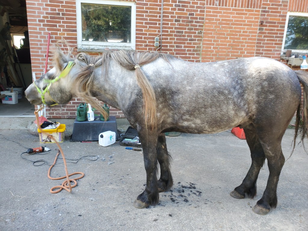 Einmal die Kehle runter, die Brust frei, unter der Mähne den Hals entlang und auf der anderen Seite vom Hals, wo ich keine Mähne hat, hat sie mit dem Strich geschoren, damit ich nicht so albern aussehe. Und diesmal hat sie ganz zufrieden geguckt und gesagt, das sei das erste Mal, dass das, was sie da geschoren hat, anständig aussieht. Das will sie jetzt immer wieder machen bis mindestens Oktober und dann schauen wir mal wie ich mich damit fühle.