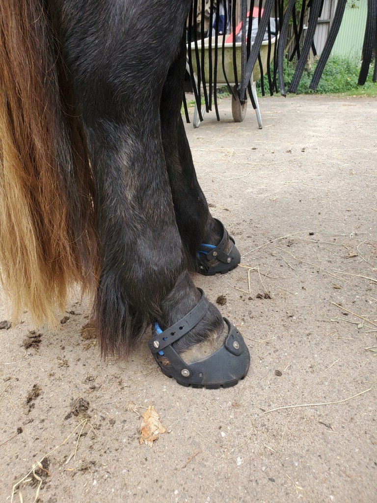 Zu Hause hat mein Mädchen dann meine Hinterhufe besonders genau angeschaut. Die neuen Schuhe haben einwandfrei gesessen (es war aber auch keine sehr wilde Tour, ehrlich gesagt) und nur an einer Stelle ein bisschen gescheuert, da muss sie jetzt noch eine Schraube abschleifen, ansonsten sieht das vielversprechend aus.