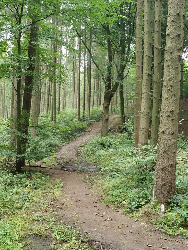 Dann den kleinen, schmalen Pfad entlang. Immer im Turboschritt. Links um den Baum, rechts um den Baum, links um den Baum. Bisschen hoch, bisschen runter. An einer Stelle hat der Regen die Wurzeln so frei gewaschen dass es fast so ist wie eine Treppe runter steigen. Meinem Mädchen ist das Herz in die Hose gerutscht aber ich hab kurz gebremst, überlegt, meine Füße sortiert und schon waren wir wohlbehalten unten. Ich kann das, Mädchen, lass mich nur machen!