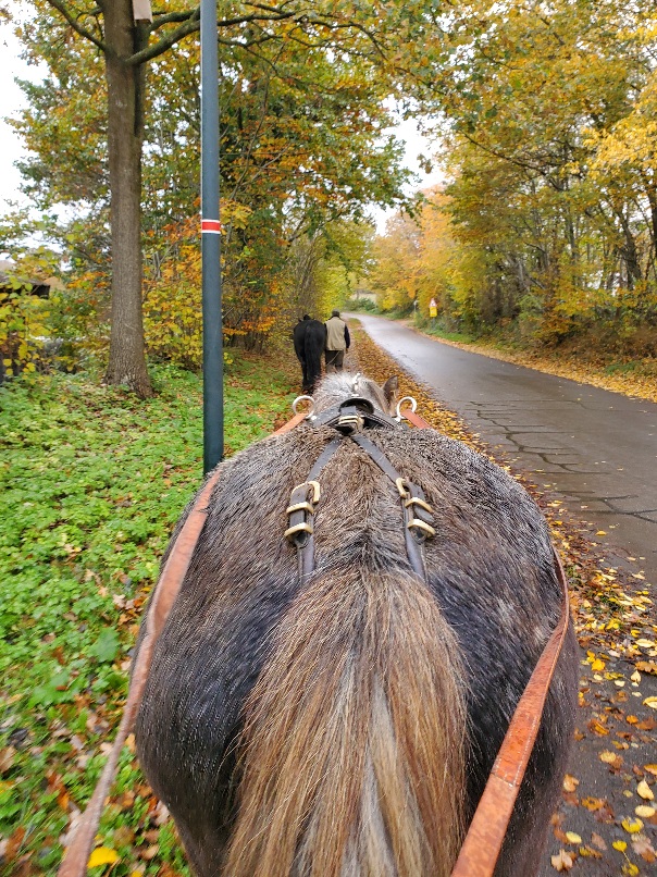 Überhaupt war mein Mädchen bezüglich all der Dinge die es so zu sehen und zu hören gibt, anders drauf als sonst. Sie sagt, wir üben jetzt was neues und das nennt sich „Ignoranz“. Da bin ich nämlich nicht so gut drin, aber als Kutschpony und auch zum Ausreiten ist das eine wichtige Fähigkeit. Bisher war es meinem Mädchen ja wichtig, dass ich mir alles in Ruhe anschaue, aber jetzt, meint sie, sei es Zeit für das nächste Level. Weil ich die allermeisten Sachen schon oft gesehen hab. Und weil es unpraktisch ist, wenn ich dauernd zur Seite schaue – ganz besonders beim Kutsche fahren – und dann nicht mehr flott geradeaus marschiere. Ich soll mal ganz gleichmäßig weiter laufen und dabei nur dezent meine Umwelt wahrnehmen, meint mein Mädchen, und hat mir gesagt, dass ich das jetzt auch kann. Sie hat derweil geübt, die Leinen richtig zu handhaben. Es ist nämlich so, dass das Fahren doch anders ist als das Reiten und vor allem ist es nochmal anders weil das Gebiss in meinem Maul unsere einzige direkte Verbindung zueinander ist, deswegen dürfen die Leinen nicht so doll durchhängen, vor allem dann nicht, wenn ich unsicher bin! Dann muss ich fühlen können, dass mein Mädchen da ist und „Regie führt“. Mein Mädchen ist aber so ein „Loslasser“ und muss deswegen üben, mehr Kontakt mit mir zu halten und dann wenn sie nachgibt, nicht zu flott nachzugeben, sonst bin ich nämlich verwirrt, weil das Gefühl plötzlich weg ist. Das hat sie beim letzten Unterricht gelernt und heute hat sie das geübt, während ich Ignoranz geübt habe. Und wir beide haben das ganz prima gemacht und waren nachher sehr stolz auf uns! Auf dem Heimweg sind wir noch ein Stückchen getrabt, schön langsam, weil mein Mädchen ja hinterherlaufen musste. Auch das hab ich total fein gemacht und also sind wir ganz zufrieden mit unserem Ausflug. Hoffentlich geht es dann nächsten Sonntag endlich mal wieder länger raus, wenn Diego wieder so richtig gut zu Huf ist!