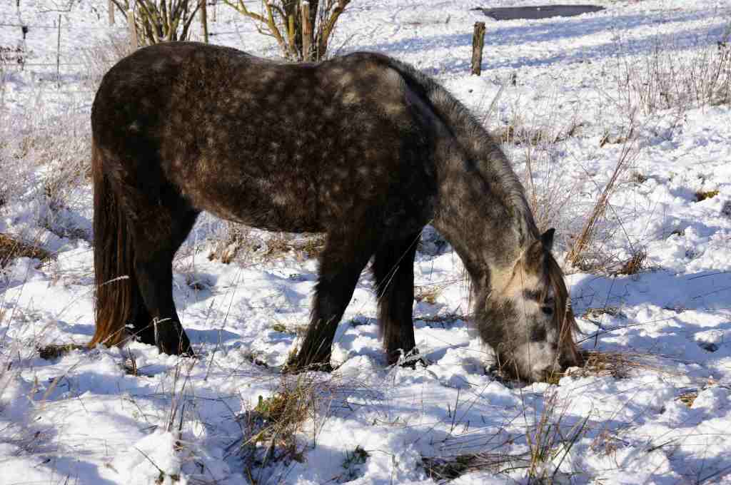 Und tagsüber dürfen wir tatsächlich trotzdem noch ein bisschen auf die Weide! Mein Mädchen sorgt dafür, dass wir vorher nochmal Heu essen, damit wir nicht so hungrig das kalte Gras in uns reinstopfen. Als ob das so einfach wäre! Weil wir das Gras ja erst aus dem Schnee wühlen müssen. Aber toll ist das trotzdem, so viel schlemmen!