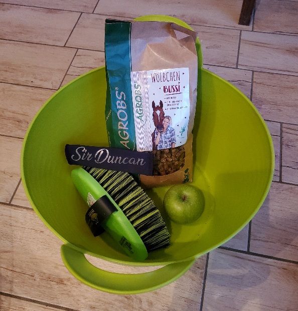 Unübersehbar ist ja wohl die grüne Schüssel! Extra in „meinem“ grün. Überreicht von einer Dame, die sich voll gut mit Distanzreiten auskennt und die meinte, das sei jetzt meine Distanzreitschüssel. Das ist die Schüssel, aus der ich auf Distanzritten in der Pause ein paar Körnchen essen soll. Körnchen! Da hat mein Mädchen gleich mal gelacht und gesagt, bis ich Körnchen bekomme (also Hafer oder so was leckeres), geht noch viel Zeit ins Land. Aber auf „Pseudokörnchen“ (also getreidefreies Schmatzofatz) könnte sie sich einlassen. Naaaaa gut, aber wenn ich wirklich mal viele Kilometer machen soll, müssen wir schon nochmal über die Körnchen reden, mein Mädchen! Hafer macht nämlich gute Laune, das seh ich doch an Diego! Aber sie meint natürlich, meine Laune sei gut genug.